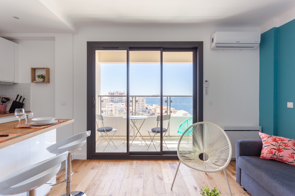 Cocoțat deasupra parterului și cu vedere la golful Marsilia, acest apartament studio sofisticat și confortabil cu 1 dormitor din centrul orașului oferă combinația perfectă de confort urban și frumusețe naturală. Pe măsură ce apartamentele din Marsilia merg, acest spațiu generos, cu aer condiționat, se află la vârful opțiunilor Airbnb din regiune, oferind lumină solară pe tot parcursul zilei și vedere nesfârșită la mare și la munte.