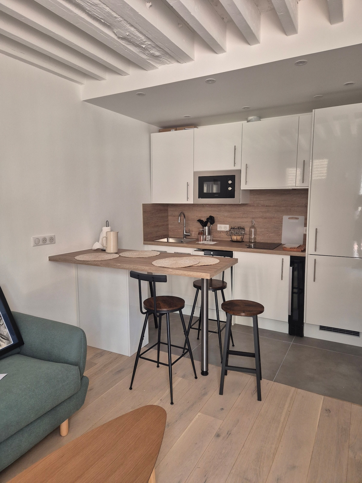 Authentic Paris at its most bohemian chic! This bijoux duplex apartment on the Left Bank in the heart of St. Germain is situated in a historic 17th century building just opposite the Musee Mailol and Fontaine des Quatre Saisons. The flat has been recently and totally renovated. The rustic stone walls and antique ceiling beams have been exposed and carefully restored on both levels. Modern design elements and understated hip luxury integrate with the buildings original features to make this flat the perfect city escape for the discerning traveler. The spacious and quiet bedroom on the 2nd floor features a French-made luxuriously comfortable king size bed (180cm) complete with the finest feather and hypoallergenic (upon request) bedding, built in closet, oak chest of drawers and a full length floor mirror. The ultra contemporary ensuite bathroom is decorated in calming hues of gray and beige, has a rain shower, toilet, sink and a towel heater. On the first level a fully equipped kitchen/ living and dining area have been tastefully outfitted with a mixture of modern classics and unusual finds, offering the utmost in comfort in a cool and casual setting designed to make your stay in the City of Lights a very special one. Private access via the main entrance, this duplex is an independent apartment. We are always available for anything that you might need during your stay, and happy to assist in making your time in paris perfect! This chic one bedroom duplex is ideally located in the heart of the sought-after Rive Gauche/St. Germain neighborhood. The lively and cultivated Left Bank district boasts some of city’s finest shopping, dining and culture. Here is where you’ll find hip one-of-a-kind boutiques to high-end designer fashion, antique galleries (Carre des Antiquaires), as well as many modern-classic design shops. An array of delightful culinary offerings and dining experiences at every turn make this arrondissement quintessential Paris at its very best! The recently opened Beau Passage, adds yet another gourmet haven to the neighborhood. We are situated within a short walking distance to many of the main attractions of central Paris including: The Louvre, Musee D’Orsay, Musee Maillol, Seine River, Invalides, all of St. Germain and the Latin Quarter, Notre Dame Cathedral, Le Bon Marche department store, Cafe Flore, Cafe Deux Magots and more. There are 3 Metro stations serving this area: Rue du Bac on Line 12, Sevres Babylone on Line 10 and 12 and St. Germain des Pres on Line 4. 1. Please note that due to the historic nature of the building and certain restrictions on construction, the flat is not air-conditioned. A fan is provided, however, due to the the old thick stone walls the apartment stays rather cool even on the warmest of summer days. 2. The apartment has an interior stairway from the living/dining room to the bedroom/bathroom and therefore may not be suitable for those with limited mobility. 3. This apartment can only comfortably accommodate 3 people. Children above the age of 12 years old are welcome. 4. While the kitchen is very well equipped, there is no dishwashing machine.