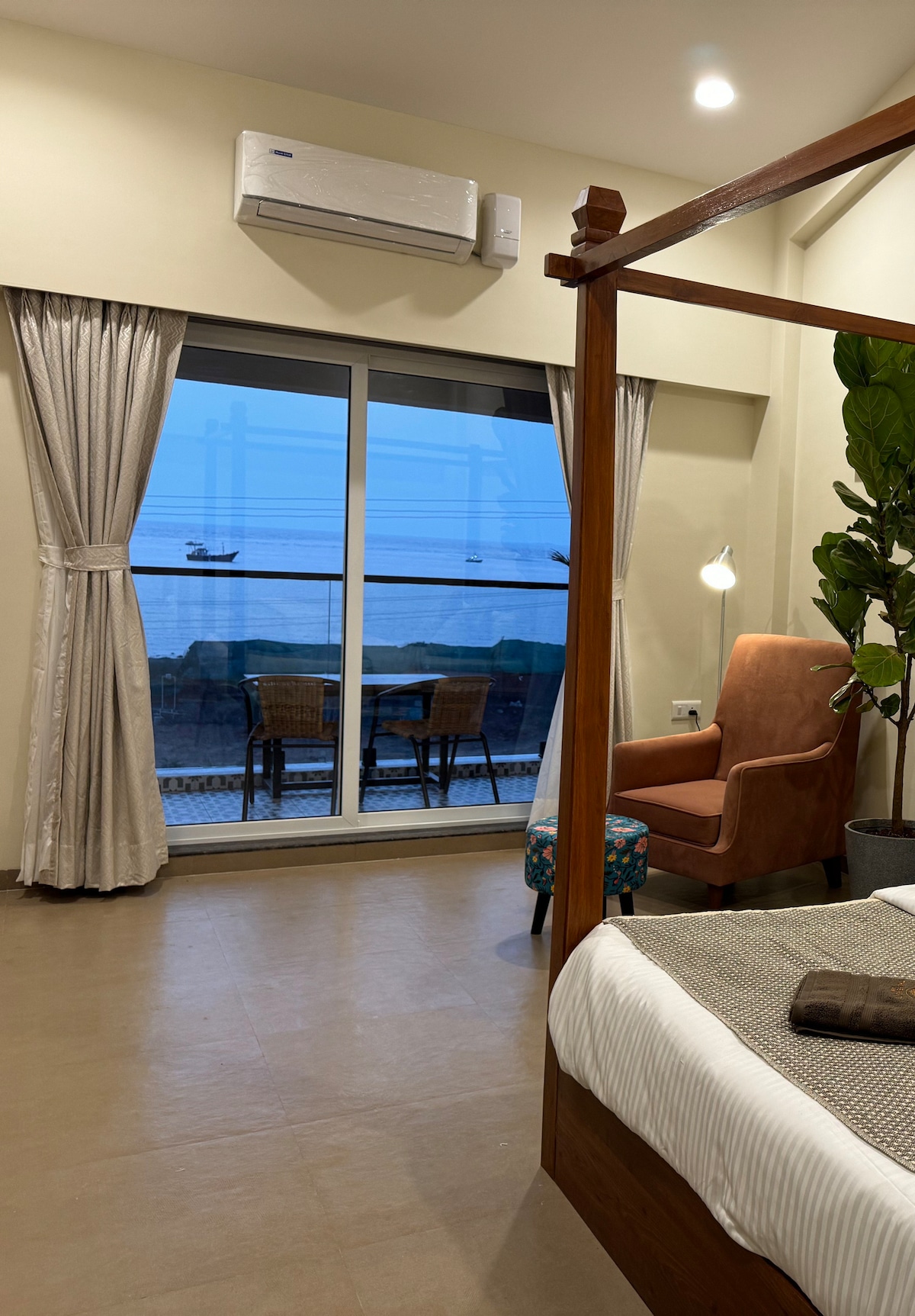 Vilă mare cu 2 dormitoare, 6 locuri de dormit, vedere la ocean din fiecare cameră, plajă sau întinde-te pe hamace sub un baldachin de cocotieri, bucură-te de nuci de cocos proaspete din copacii noștri, mese gătite în casă, vreme răcoroasă, cer luminat de stele și o plajă retrasă. Vizitează piața de pește Murud pentru capturi proaspete, explorează ruinele creole de la fortul Revdanda (20 de minute cu mașina) sau închiriază biciclete sau bărci cu banane și explorează satul Nandgaon. Ideal pentru familii, cupluri sau reuniuni. Disponibil pentru închiriere privată cu bucătar, curățător, grădinar.