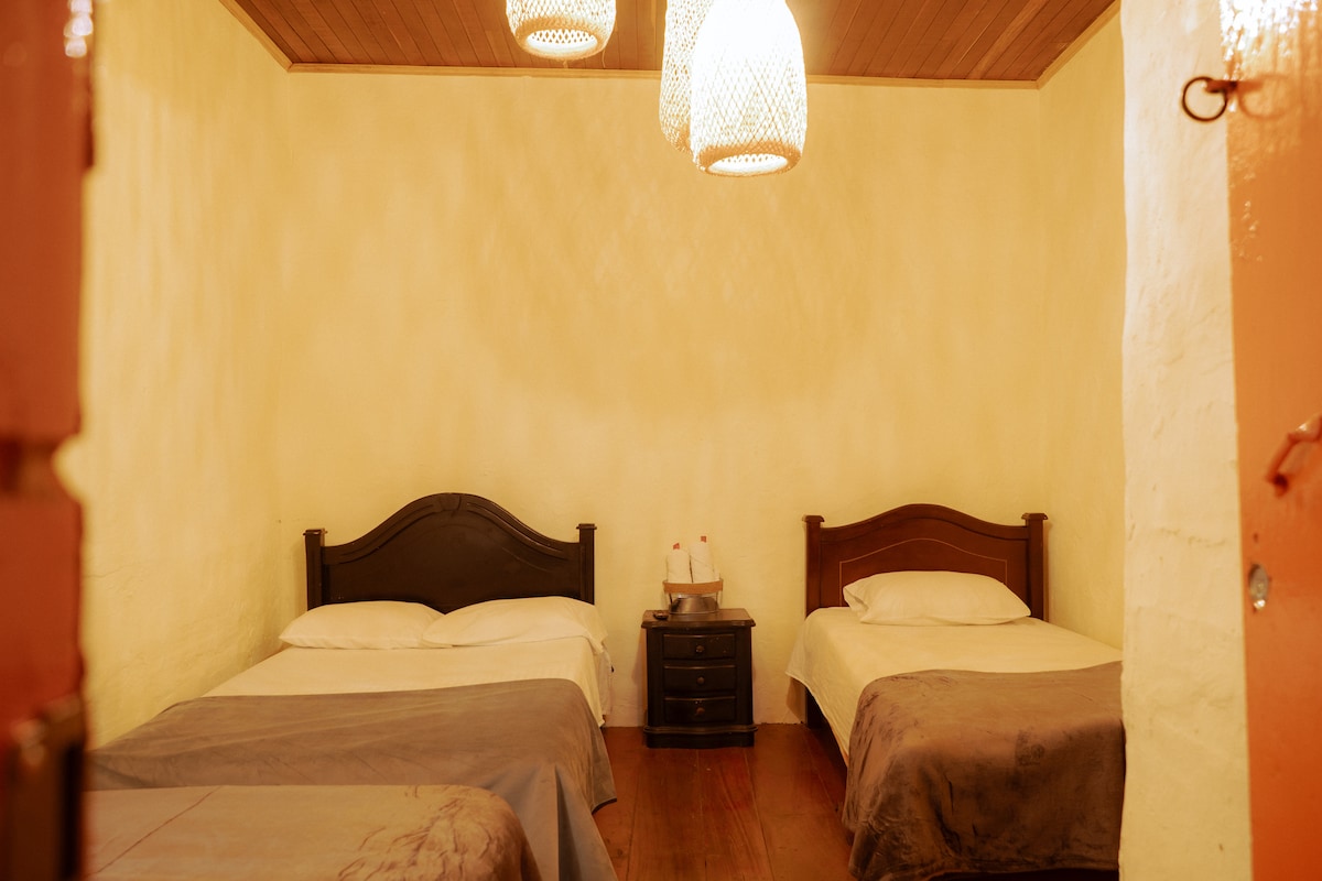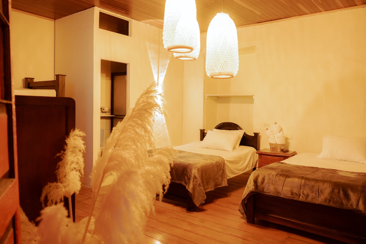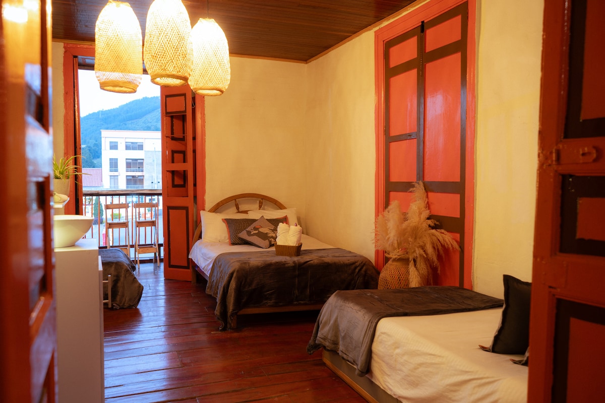 Amplia habitación triple en una casa colonial restaurada, con techos altos, pisos en baldosa artesanal y detalles en madera que evocan la tradición local. Equipada con 1 cama doble queen y 1 sencilla, baño privado con agua caliente, escritorio de trabajo y WiFi de alta velocidad con conexión directa al módem. Su decoración mezcla artesanías y diseño contemporáneo, ofreciendo un homenaje a la cultura regional, ideal para familias o grupos que buscan confort y autenticidad.