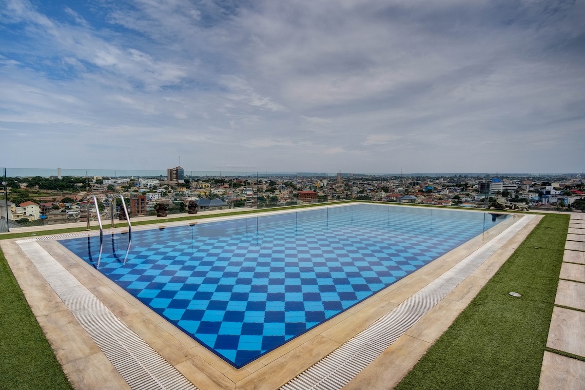 Keep it simple at this recently refurbished,sparkling clean and centrally-located place only 4mins away from Kotoka International Airport (KIA). The studio comes with: - Free & Fast Wifi (> 60Mbps) - Smart TV with Netflix & DSTV - A large comfy bed; fits 2 adults. - Exclusive access to rooftop pool -In-unit washer/Dryer - Free parking - Onsite Gym & Cafeteria - Private balcony with garden view - 24 hours security and CCTV - Personalized fingerprint security access to The Lennox development.