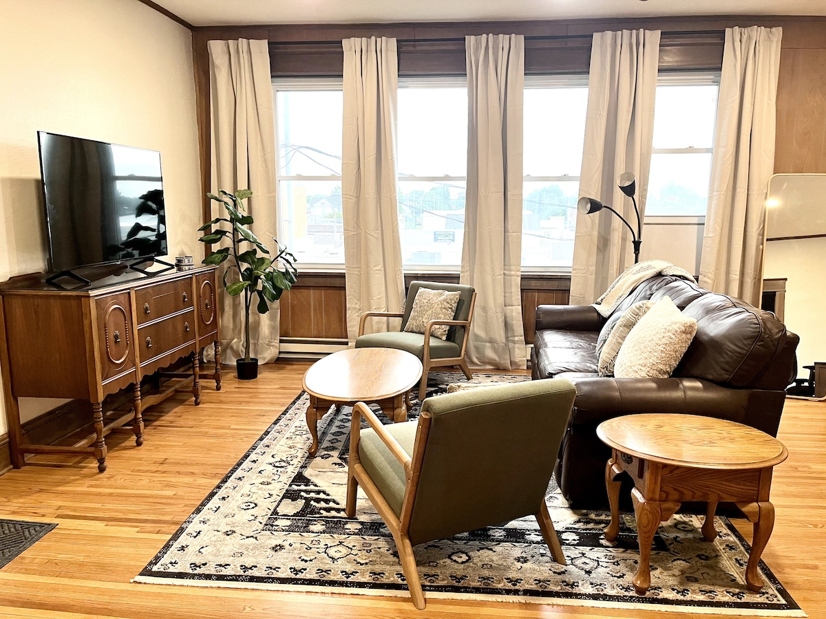 Acest apartament fermecător cu un dormitor este situat într-o clădire istorică construită în jurul anului 1890, inițial pentru a fi utilizată ca spații de locuit deasupra unei piețe de fructe în apropierea unui depou de trenuri. Apartamentul a fost recent remodelat, oferind o bucătărie completă cu un perete de ferestre orientate spre vest, un living confortabil, un living confortabil, un dormitor bine luminat, o cadă cu gresie și mașină de spălat și uscător de dimensiuni normale. Este confortabil pe tot parcursul anului cu încălzire cu aer mini-split și AC. Apartamentul este complet mobilat.