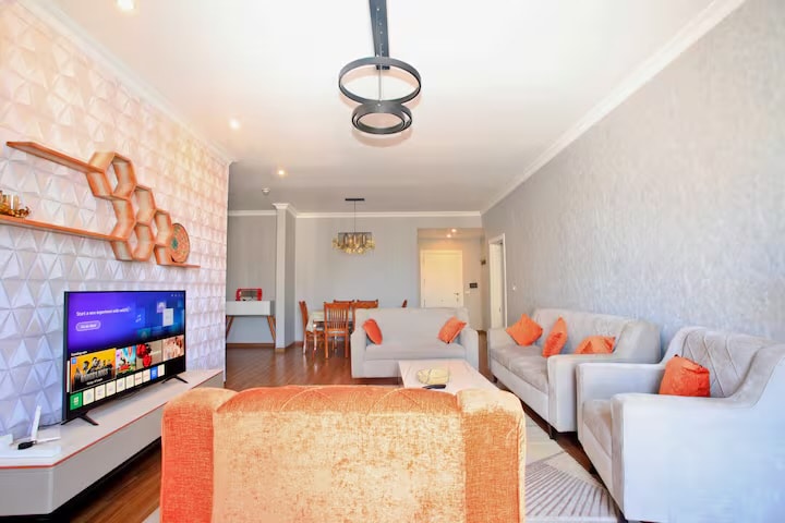 Apartament de lux în zona Hayahulet din Addis Abeba, cu 2 dormitoare, 2 băi complete, o bucătărie completă, bar, living cu zonă de lucru, parcare dedicată, Wi-Fi și generator de rezervă. Perfect pentru călătorii de afaceri sau șederi prelungite. La doar 10 minute de aeroport și la 5 minute de gară.