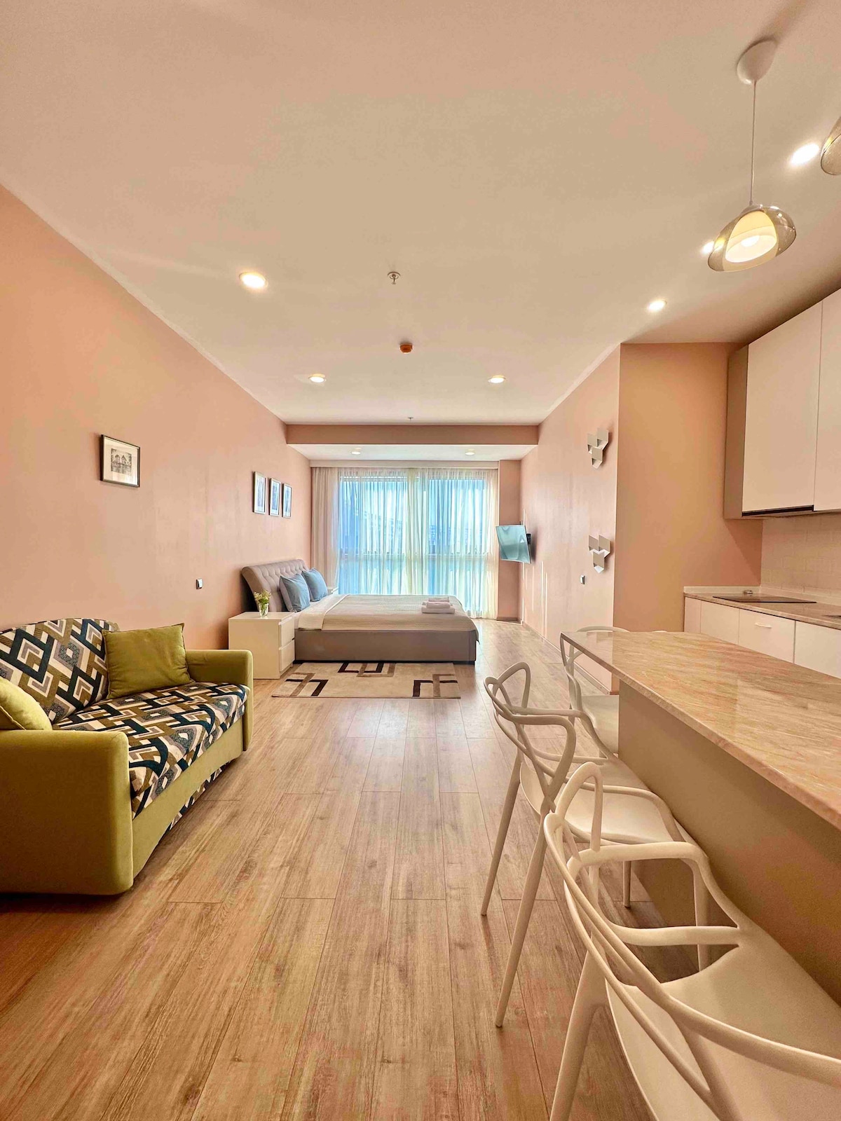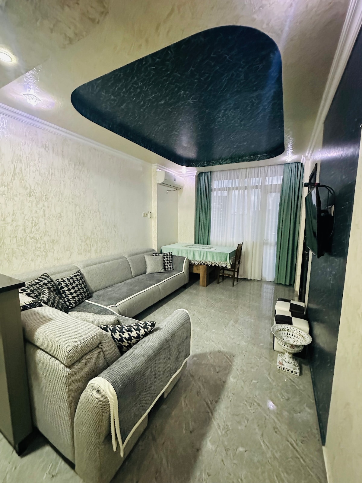 Apartament cu două camere, în centrul noului Batumi, pe prima coastă. În care am încercat să efectuăm renovări într-un stil modern, am plasat accente cu lumină în trei combinații. Textilele și materialele de mobilier au fost selectate cu atenție pentru a se potrivi. Nu ne-am zgârcit la instalațiile sanitare și de uz casnic. Sperăm că oaspeții noștri vor fi mulțumiți și cu siguranță vor reveni la noi. Pentru rezervările de lungă durată, sunt gata să ofer o reducere suplimentară.))