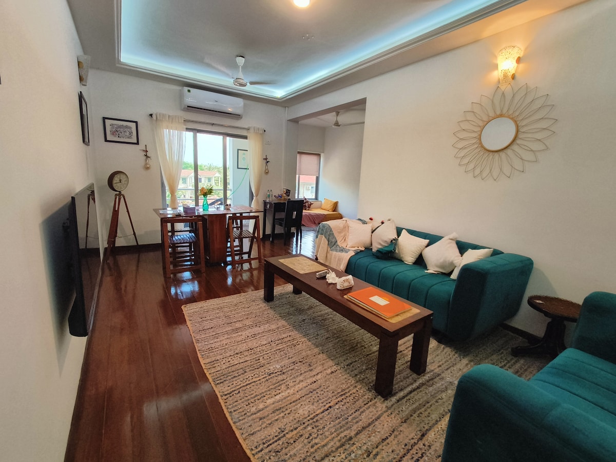 Bine ai venit la casa mea de vacanță confortabilă. Amplasate în mijlocul a nenumărați nuci de cocos, vibrațiile Goa sunt la punct aici. Acest 1bhk este perfect pentru până la 3 persoane și are tot ce-ți trebuie. Wi-Fi, o bucătărie bine aprovizionată, balcon spațios și living, un televizor inteligent, priveliști bune și, desigur, vibrații bune! Poți face o baie relaxantă în piscină, te poți antrena în sala de gimnastică sau poți sări pe plaja Sweet Lil Uddo pentru apus de soare și caiac. Locație centrală, dar liniștită, într-o societate frumoasă închisă.