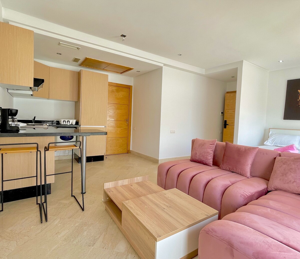 Experimentează confortul în studioul nostru confortabil din Rabat. Ideal pentru 2 oaspeți, are o zonă de living spațioasă cu o canapea confortabilă pe colț și o zonă separată de dormit cu un pat de lux. Bucură-te de dotări moderne, Wi-Fi de mare viteză și o chicinetă complet echipată. Perfect pentru șederi de scurtă durată, acest studio fermecător este aproape de atracții de top, restaurante și cumpărături. Rezervă-ți șederea pentru o vizită memorabilă în Rabat!