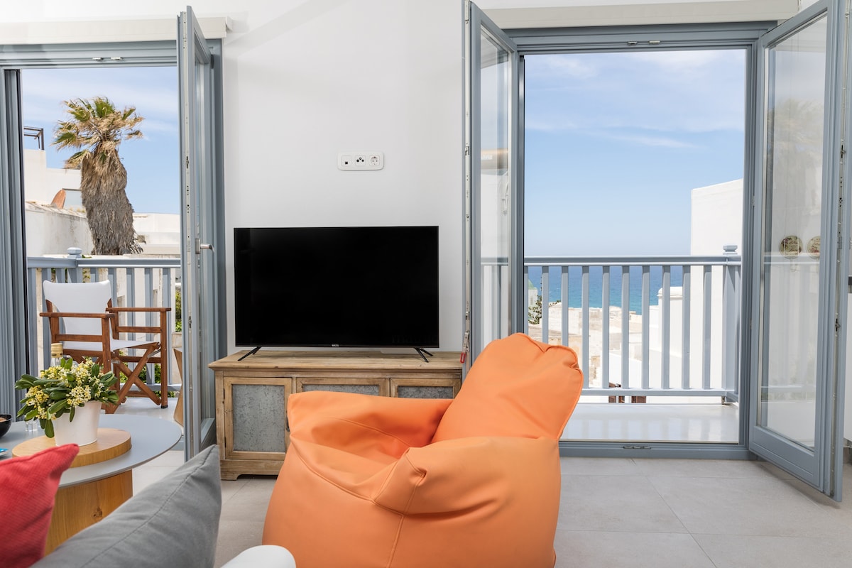 Construit în jurul arcadelor cicladice numite Camares, aproape la intrarea în castel, studioul este situat într-un cartier bine-cunoscut, care combină atât intimitatea, cât și viața vibrantă a restaurantelor baruri de vinuri și orice fel de magazin. Garsoniera are un pat king-size, o canapea extensibilă pentru 2 persoane, o chicinetă și o baie privată, precum și o terasă privată cu vedere la mare și străzile aglomerate. Portul, plaja și două locuri de parcare publice sunt, de asemenea, foarte aproape de apartament.