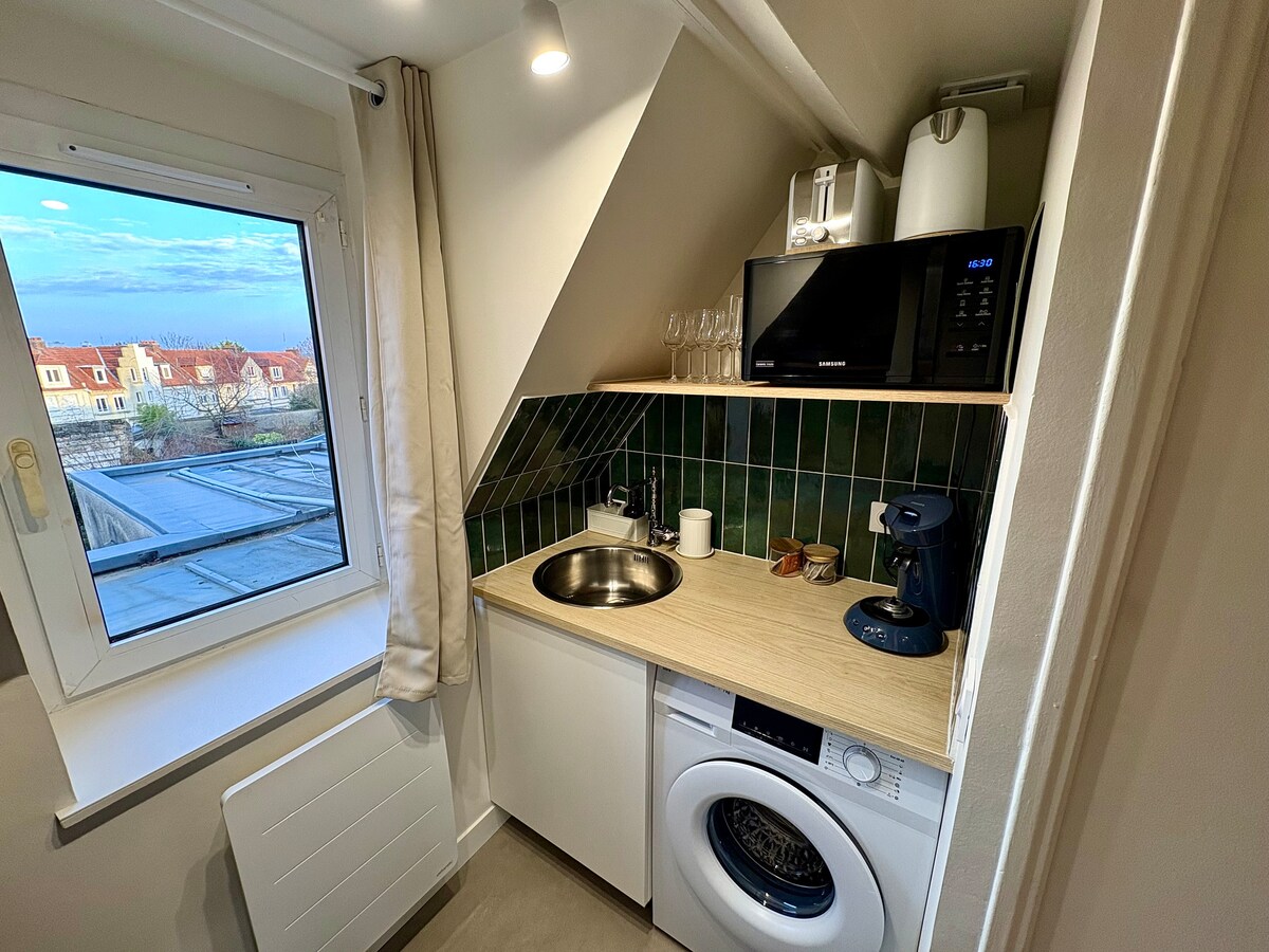 Bucură-te de un studio fermecător renovat la poalele clopotniței și de piețele magnifice din Arras. Cu o suprafață de 25 m2 și situat la etajul 3 (fără lift), include un spațiu de locuit spațios (pat dublu 160 x 200 cm, TV inteligent și dulap mare de depozitare). O zonă de gustări este integrată în bucătărie (frigider, aragaz, cafetieră SENSEO, fierbător de apă, fierbător de apă, prăjitor de pâine). Baia este dotată cu duș mare, uscător de păr, uscător de prosoape și toaletă.