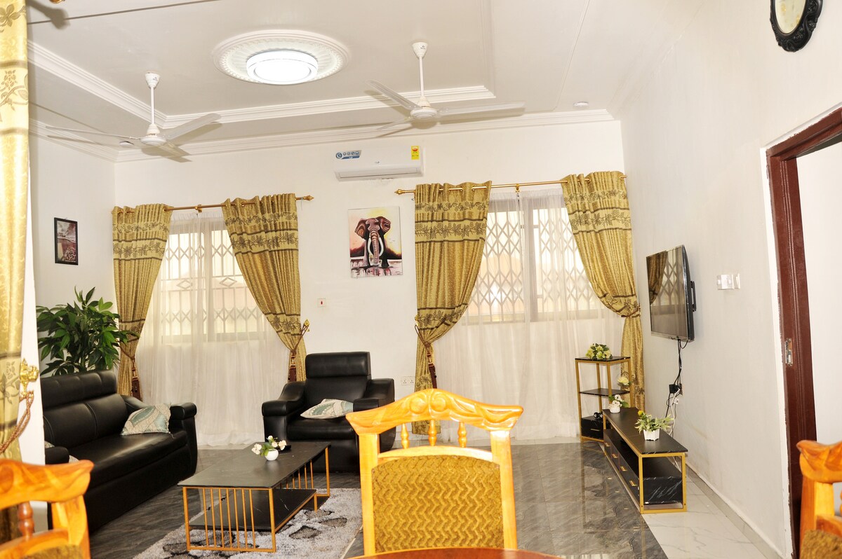 Have fun with the whole family at this stylish place, immaculately styled and furnished to suit your family and upscale lifestyle. Enjoy our 2 bedroom, 3-beds, wifi, boardgames, exercise bike, large TV, home-theater with a powerful subwoofer bass, air-conditioned and fully furnished kitchen. This apartment is 5 minutes drive to KNUST junction, less than 20 minutes to Adum, 3 minutes to SG mall, and has a stylish and royalty office space.