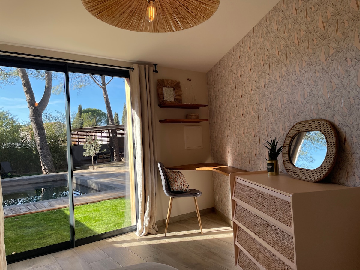 ECRAN VERDE Logt de 60 M2 ( living, bucătărie , 2 dormitoare, 1 baie + 1 toaletă ind.) situat la parterul unei case cu terasă privată. parcela de 28OO M2 și piscina sunt în comun cu proprietarii. Situat la 2 pași de Montpellier ( 15 minute) și de mare într-un sat medieval. Toate facilitățile pentru magazine și transportul public. Închiriere gratuită de biciclete. Drumeţii la faţa locului. Acces la facilități de fitness + trambulină + masă sub pini......Bușteni ideali pentru familie.