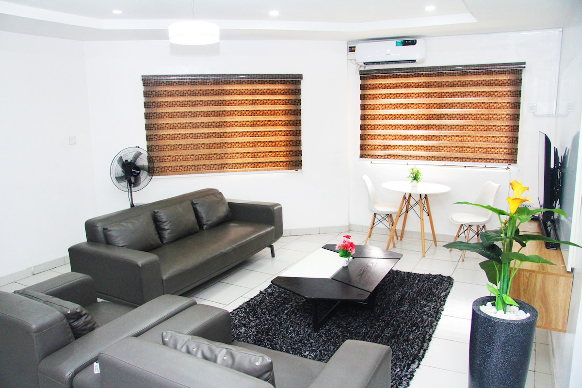 Nestled in a prime location, CasaGialo is a private 2bedroom duplex house , in self compound Gated with own clean water supply,mosquito nets, fully air conditioned , a Garden , balcony and patio . You will have access to all utilities in the house including 2 bedrooms with each ensuite , 2 livingrooms /game room , fully fitted kitchen, laundry area, 3 toilets and 2 baths . 💯 privacy is guaranteed. You will have 24 hrs electricity,air-conditioning CCTV, and has been seasonally fumigated .