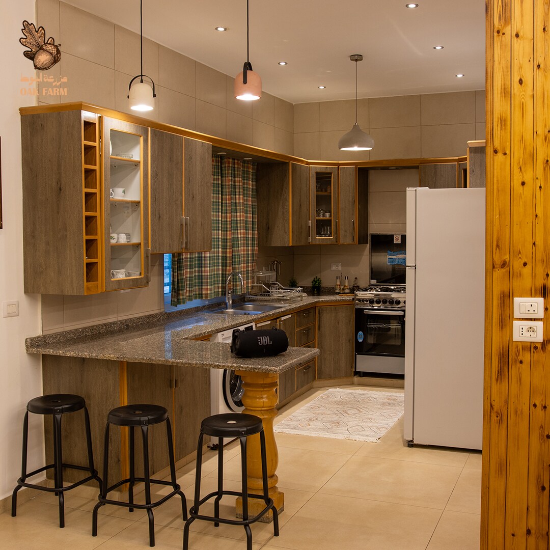 Bine ai venit la evadarea ta perfectă la țară! Amplasată în inima orașului Ajloun, această fermă fermecătoare oferă cel mai liniștit refugiu. Cu trei terase spațioase, te vei bucura de priveliști uluitoare ale maiestuosului Castel Ajloun și ale încântătorului Ajloun Teleferik. Locuința noastră este înconjurată de măslini luxurianți, creând un mediu liniștit. În interior, vei găsi un spațiu confortabil, frumos amenajat, cu o selecție proaspătă de alimente ecologice recoltate chiar aici, la fermă.