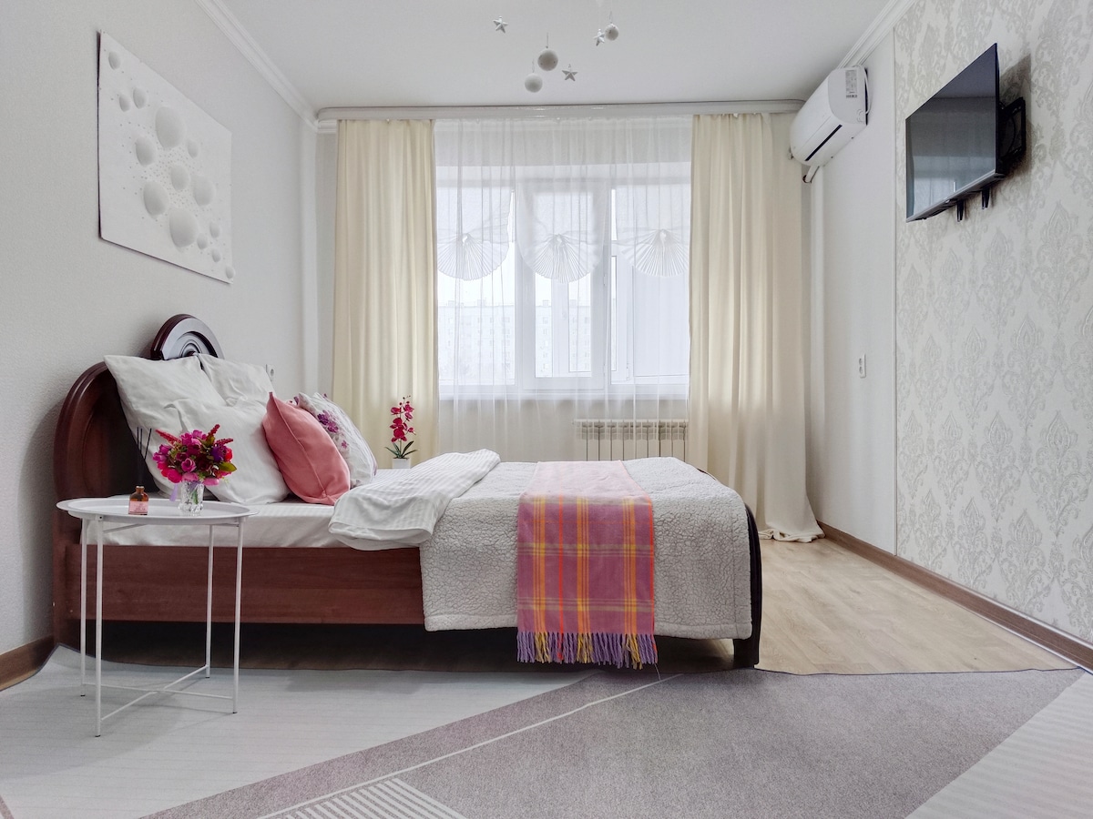 Приглашаем остановиться в нашей светлой квартире с домашним уютом и чистотой в центре города. Для вашего сладкого сна на кровати комфортный матрас с подушками и белоснежная постель. Есть все необходимое для путешественников: фен,аптечка,швейный набор...На кухне вся необходимая бытовая техника, посуда для сервировки и приготовления пищи. Предоставляем командировочные документы.В пешей доступности аквапарк,Храм,Мечеть,клиники,аптеки и пр.В доме есть магазины,салоны и мн.др. Новая детская площадка.
