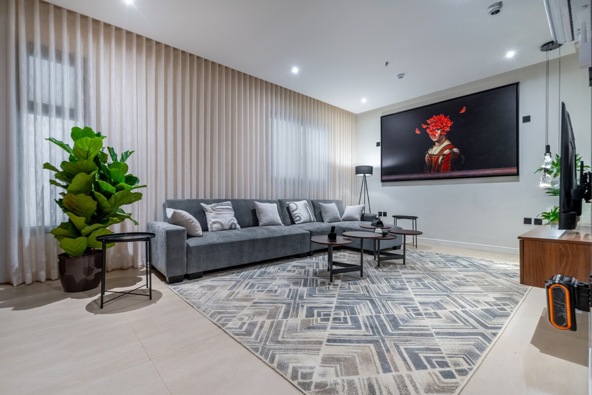 Bucură-te de o experiență minunată cu persoana iubită într-unul dintre cele mai luxoase apartamente din centrul orașului Al Fazia. Locația a fost selectată cu meticulozitate în centrul orașului Riyadh și în cartierul de lux Al Fazia. Spațiul a fost proiectat pentru a-ți oferi un sentiment real de a fi locuința ta permanentă, așa că iau în considerare tot confortul și divertismentul , iar dotările de înaltă calitate ale locuinței au fost folosite pentru a-ți oferi o minte de lux și exclusivitate. Am ales cele mai bune minereuri de bumbac, saltele și perne de dormit confortabile pentru un somn bun. Livingul este, de asemenea, mobilat cu un gin luxos și confortabil. Poți intra în casă prin încuietoarea inteligentă.