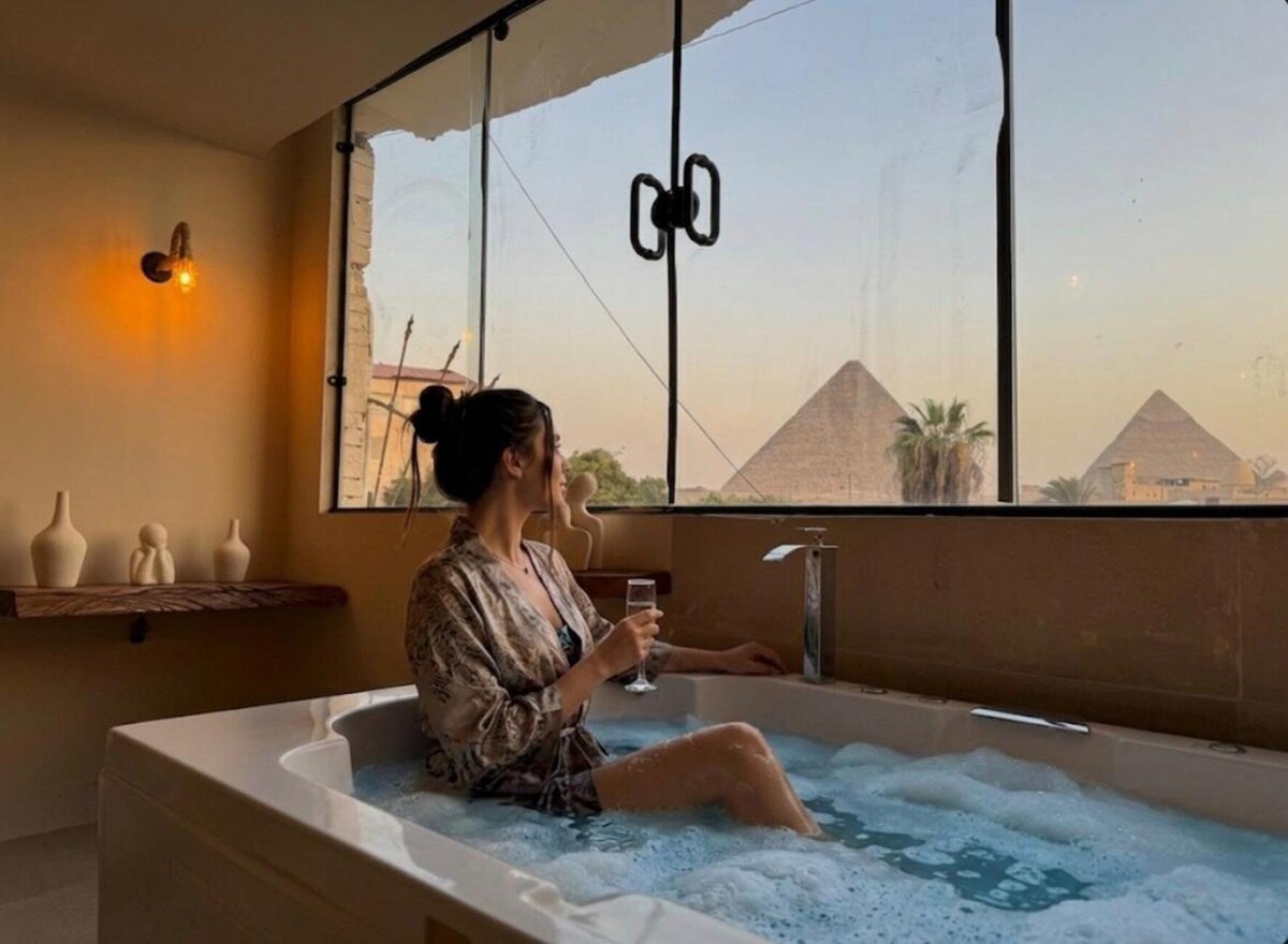 Soak in ancient beauty from your built-in jacuzzi with stunning views of the Great Pyramids, just 950m away 🛁🕌. This handcrafted retreat blends earthy textures, warm lighting, and natural charm. Thoughtfully designed for travelers who seek peace, inspiration, and authenticity. 🌿 Includes a queen bed, smart TV, Wi-Fi, and a serene atmosphere. Enjoy sunrise coffee or sunset magic over the ancient world. 📸✨