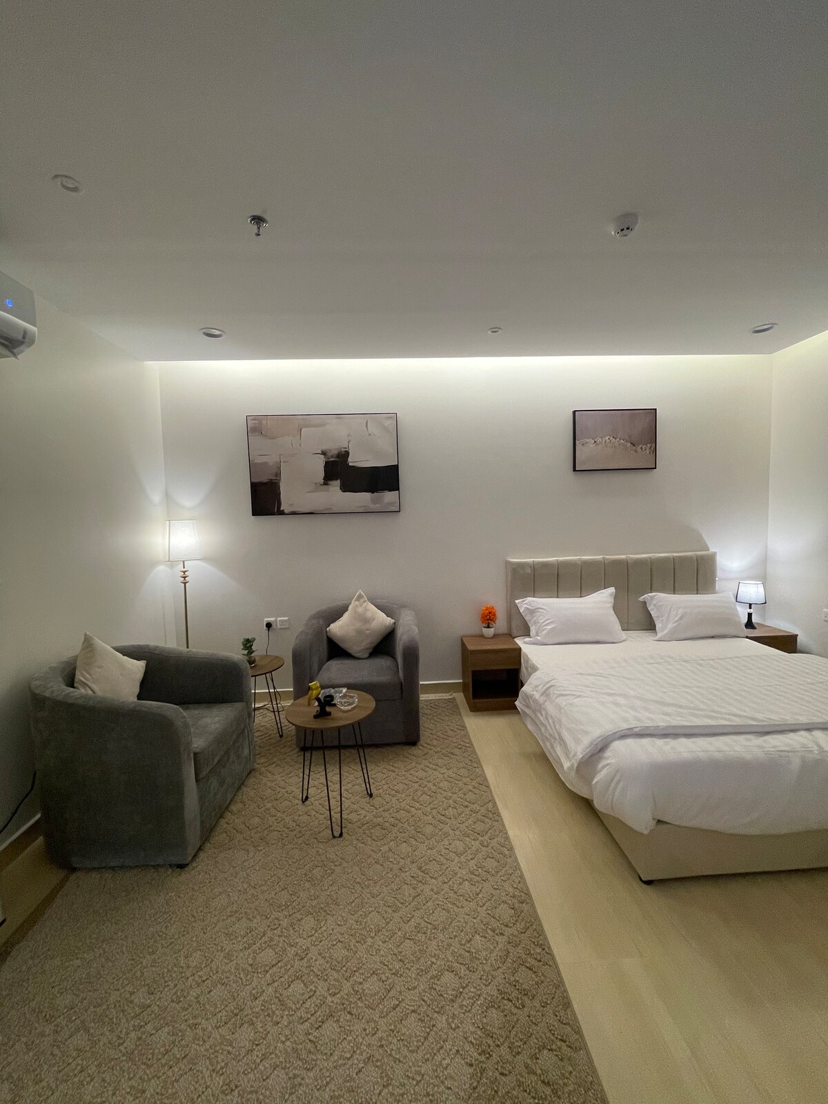 Relaxează-te în acest spațiu unic și liniștit. Apartament cu design modern Conține un dormitor cu pat matrimonial cu o saltea de hotel și un spațiu spațios cu un televizor inteligent de 80 inchi, cu sprijinul unui abonament Netflix Echipat cu un frigider, o cafenea și un ceai Fierbător și instrumente de ceai și o baie complet echipată, cu auto-inducție și o intrare privată în mașină, cu o sesiune în aer liber Locație distinctă în apropierea All Services College of Technology, Base and Institute