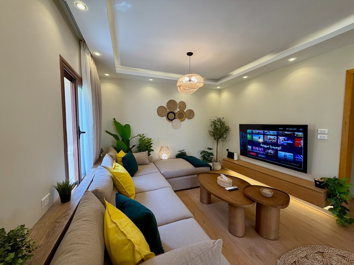 Apartament boho elegant, cu 2 dormitoare, într-o locație liniștită și relaxantă, cu vedere la o grădină mare – perfect pentru o ședere calmă și confortabilă. Bucură-te de 3 televizoare inteligente: două ecrane de 65 de inchi (living și dormitorul principal) și un televizor de 50 de inchi în al doilea dormitor — toate cu servicii de streaming incluse. Plus Wi-Fi ultrarapid și fiabil, ideal pentru lucru la distanță sau seri de film. Locație excelentă, la doar câteva minute de Gateway Mall, cu cafenele, restaurante și magazine în apropiere, în cartierul El Rehab din New Cairo.