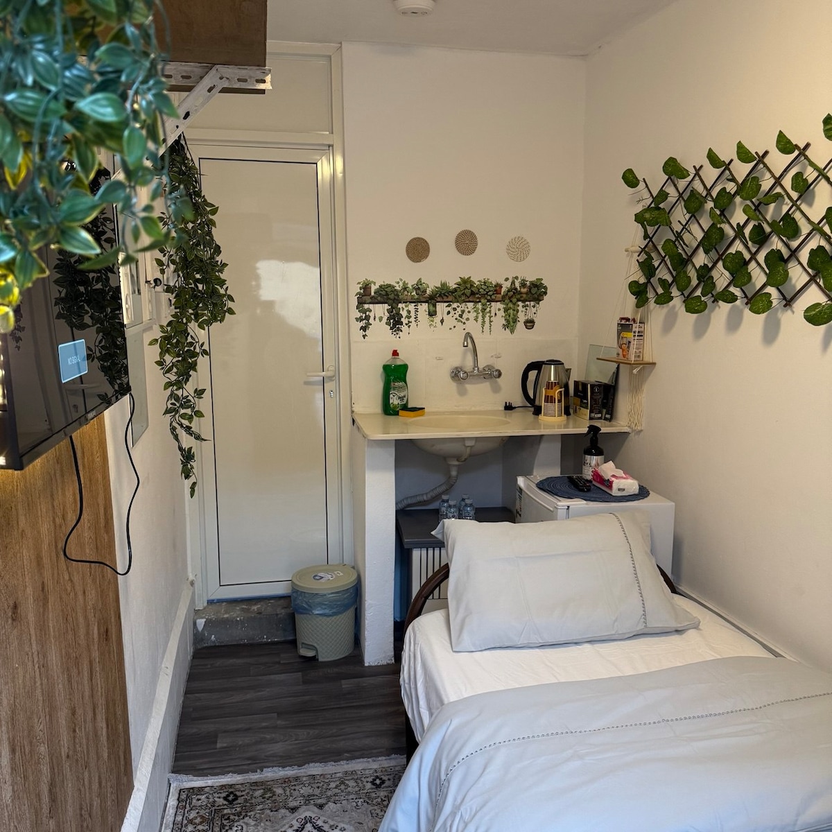 Bună ziua oaspeților noștri. Permiteți-mi să vă descriu locul și locul Cuprinde: dormitor cu pat dublu, lounge, bucatarie completa, masa pentru doua persoane, baie, spalatorie exterioara si interioara Bineînțeles că ești scumpă pentru noi. Pentru că avem un televizor inteligent și are toate programele pe care le iubești și apreciezi Netflix Și, cu siguranță, toate acestea sunt online din această cauză Are propriul internet Să sperăm că îți pot explica lucrurile Suntem onorați și înconjurați de ochii lui Dumnezeu care te întâmpină