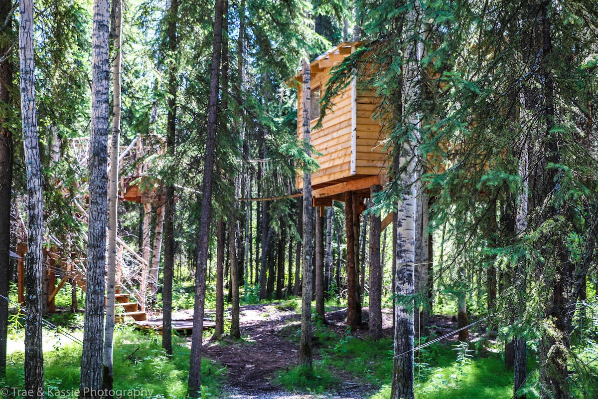 Aventura te așteaptă în casa din copac „Indiana Jones”, ascunsă la 3 metri în copaci. Amenajat ca un cort clasic de vânătoare din Alaska afară, interiorul său cald și primitor are un pat matrimonial confortabil, mobilier modern și artă unică. Pășește pe terasa acoperită pentru a te bucura de soarele de la miezul nopții și de priveliștea pădurii. Un pat suplimentar (pat pentru copii în stil camping) poate fi adăugat pentru 20 $. Această cabană este potrivită pentru câini.