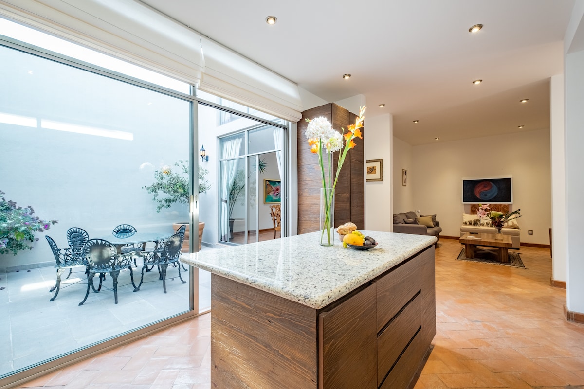 Our home is hidden behind a modest, historic facade and a narrow, lush garden, steps from San Juan de Dios church, less than 10 min walk to the main square. 3 bedroom suites, indoor/outdoor living rooms, fireplaces, 4 patios, terrace, rooftop lounge with city and sunset views. Parts of our garden wall date back to the 1700's. The house was designed in 2003 by esteemed architect Juan Carlos Valdés, with traditional elements, cantera columns, boveda and viga ceilings. Housekeeping Mon-Sat.