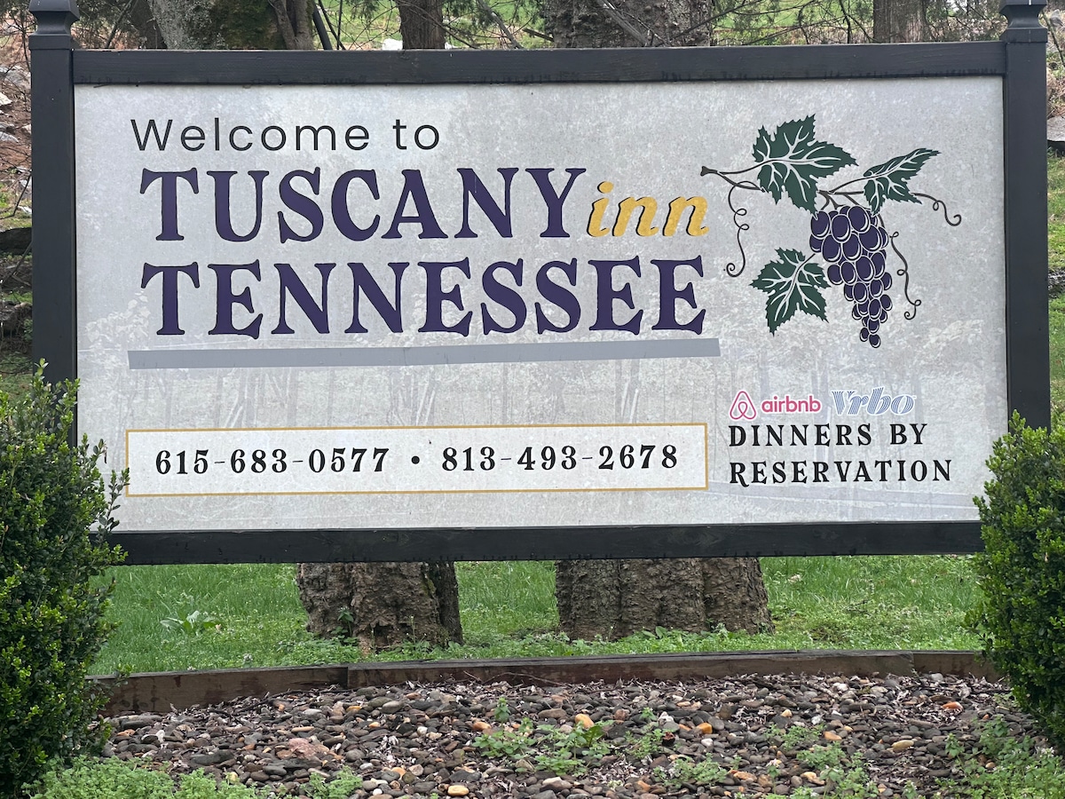 Welcome to The Grande @ Tuscany Inn—a spacious, private entry loft-style suite , full kitchen, private covered porch & private saltwater hot tub. King bed + cozy loft (great for kids). Sitting area with sofa bed. Front door opens to vineyard views and a shared piazza with fire pit, grill, and lounge area. Enjoy chef-made breakfasts, dinners, and artisanal pizza on-site (no food on Tue. and Wed. unless pre arranged Pets allowed. Near Center Hill Lake & Cummins Falls. Just 5 mi from I-40.