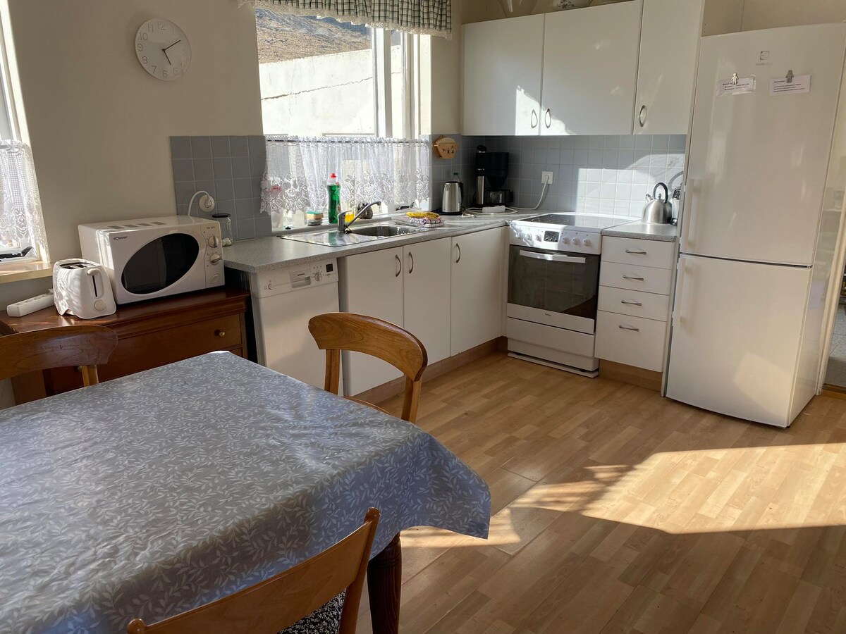 Casă privată spațioasă, locație superbă, vedere la ocean și port. În inima micului Flateyri prietenos, la 20 de minute de mers cu mașina de Isafjordur. Două etaje, 4 dormitoare mari, bucătărie mare cu tavan înalt - living și zonă de luat masa, 2 băi cu duș și 1 cadă. Grădină și terasă, cadă cu hidromasaj (vara), grătar cu gaz. Renovate de proprietari, câteva familii care împărtășesc dragostea pentru pitorescul sat Flateyri. Perfect pentru 1-4 familii sau grupuri mici. Loc perfect pentru a explora telecomenzile magice Westfjords