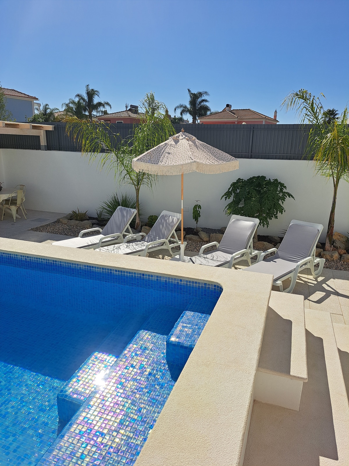 Grădina Villa Rossi Eleganță pe plajă – panoramă excepțională în Albufeira Suspendat în vârful unei stânci, acest loc rar oferă un loc de neuitat cu oceanul. Terasa sa mare, ca și cum ar pluti deasupra valurilor, se deschide spre o piscină privată orientată spre orizont. Un refugiu intim, scăldat în calm și frumusețe, la 50 m de plajă și de inima istorică.