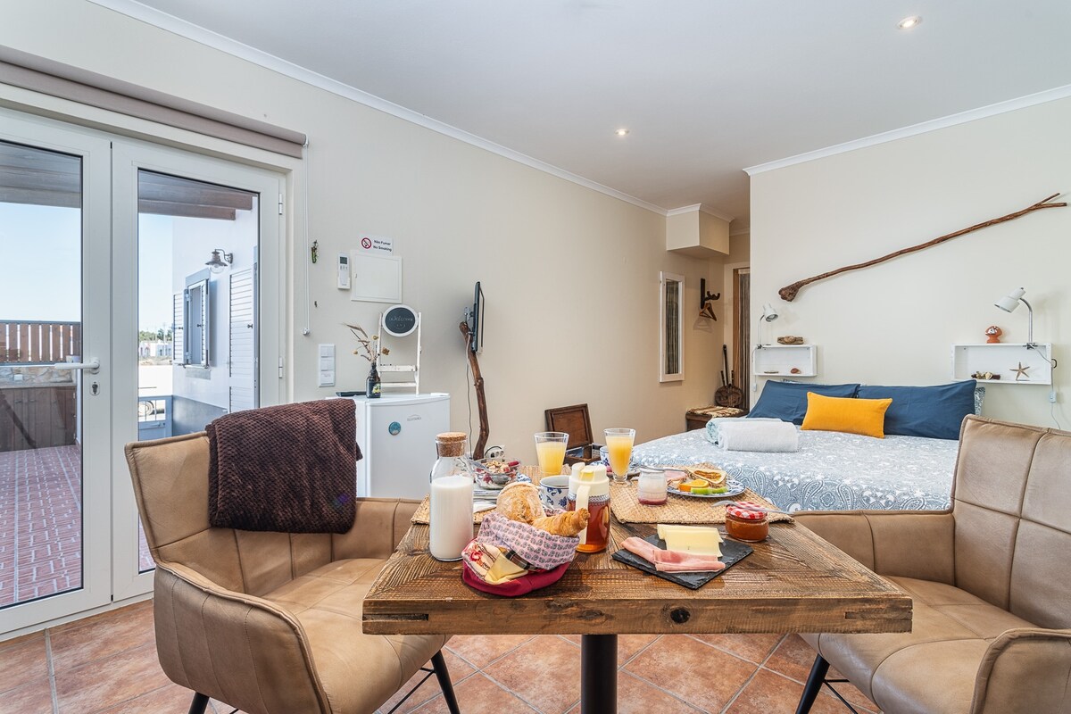 Cazează-te la Casa Alva în apartamentul nostru studio modern, situat în mijlocul dealurilor, chiar lângă orașul Aljezur și în apropiere de toate plajele de pe coasta de vest. În garsoniera cu aer condiționat găsești la parter un living ușor și spațios cu canapea extensibilă, chicinetă deschisă și baie privată cu cadă. La etaj există un pat dublu mare/ două paturi de o persoană. Garsoniera are parcare privată în față și este situată la parter, cu terasa cu vedere la dealuri.