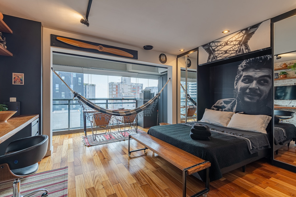 A 300 do metrô V. Madalena, perto de restaurantes, lojas, bares e espaços culturais. Cama de casal super confortável, A/C, internet, SmarTV 42", bancada grande para trabalho, mesa para refeições, decoração estilosa, janelas retráteis com muita luz natural e vista da cidade. Cozinha compacta conta com mini refrigerador, cooktop elétrico de duas bocas, filtro de água, sanduicheira e liquidificador e utensílios de louça. Piscina climatizada, academia, lavanderia e mini-loja de conveniência.