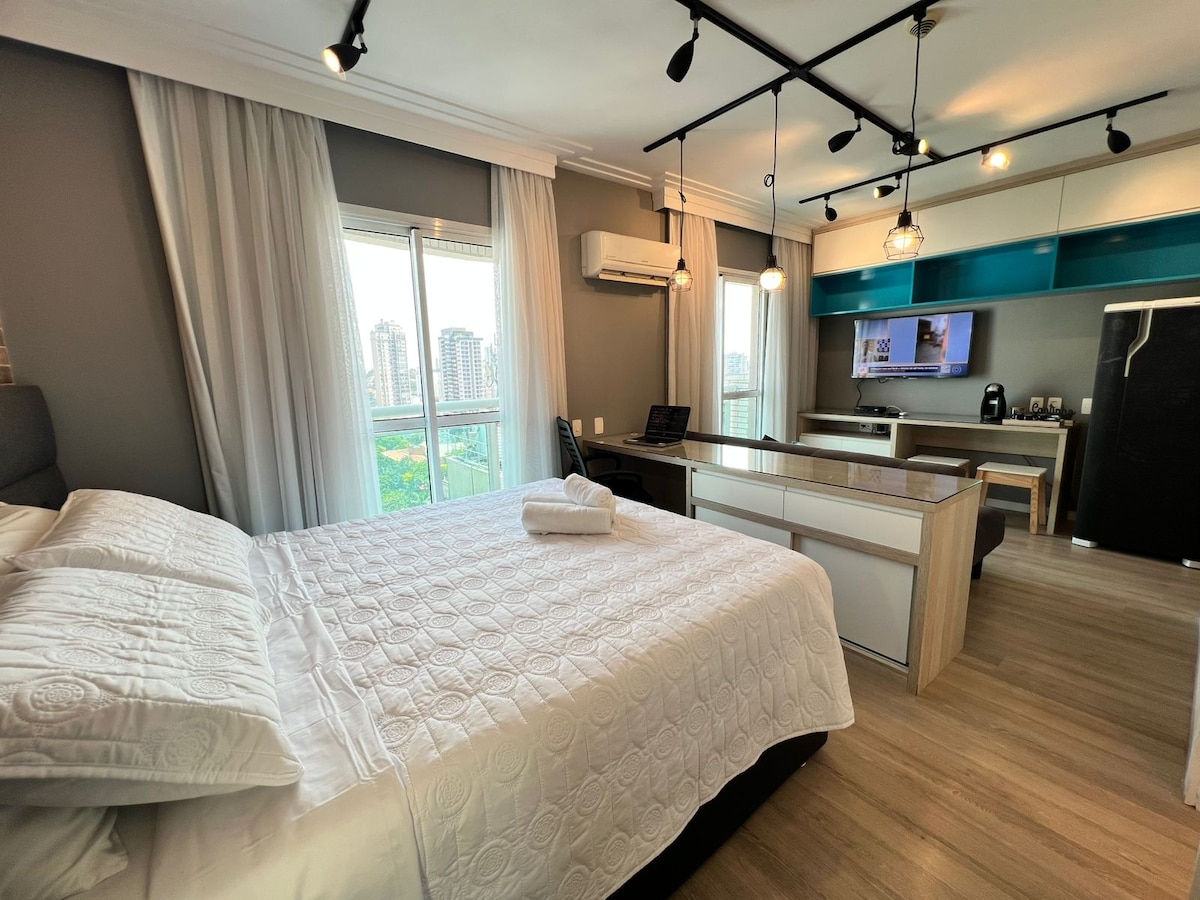 Studio tip boutique cu una dintre cele mai frumoase priveliști ale orașului São Paulo. Situat la 2 minute de mers pe jos de metrou. Bucătărie complet utilată, cu frigider ascuns de ușa din lemn. Wi-Fi, aer condiționat și TV inteligent de 55 inch. Check-in independent cu blocare electronică inteligentă. Joacă tenis sau mergi la sală de gimnastică și relaxează-te în piscine (în aer liber sau în interior încălzit) și saune (umede sau uscate) după aceea. Zona comună include, de asemenea, spații de co-working și spălătorie. Vizitatorii trebuie să fie înregistrați anterior în partea din față.