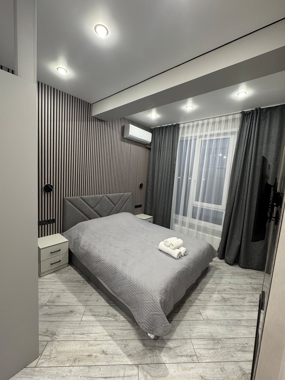 GlowNest nu este doar un apartament, ci un spațiu atmosferic creat cu suflet. Interiorul de designer, iluminatul moale, atmosfera confortabilă și detaliile atente fac ca fiecare moment să fie special aici. Am combinat confortul hotelului și căldura casei, astfel încât să te poți relaxa cu adevărat. Poziție convenabilă — 1 minut până la mall-ul Mega, aproape de cele mai bune restaurante, cafenele și Old Arbat. Totul este oferit pentru confortul tău, de la lenjerie albă ca zăpada și un set complet de bucătărie până la check-in independent