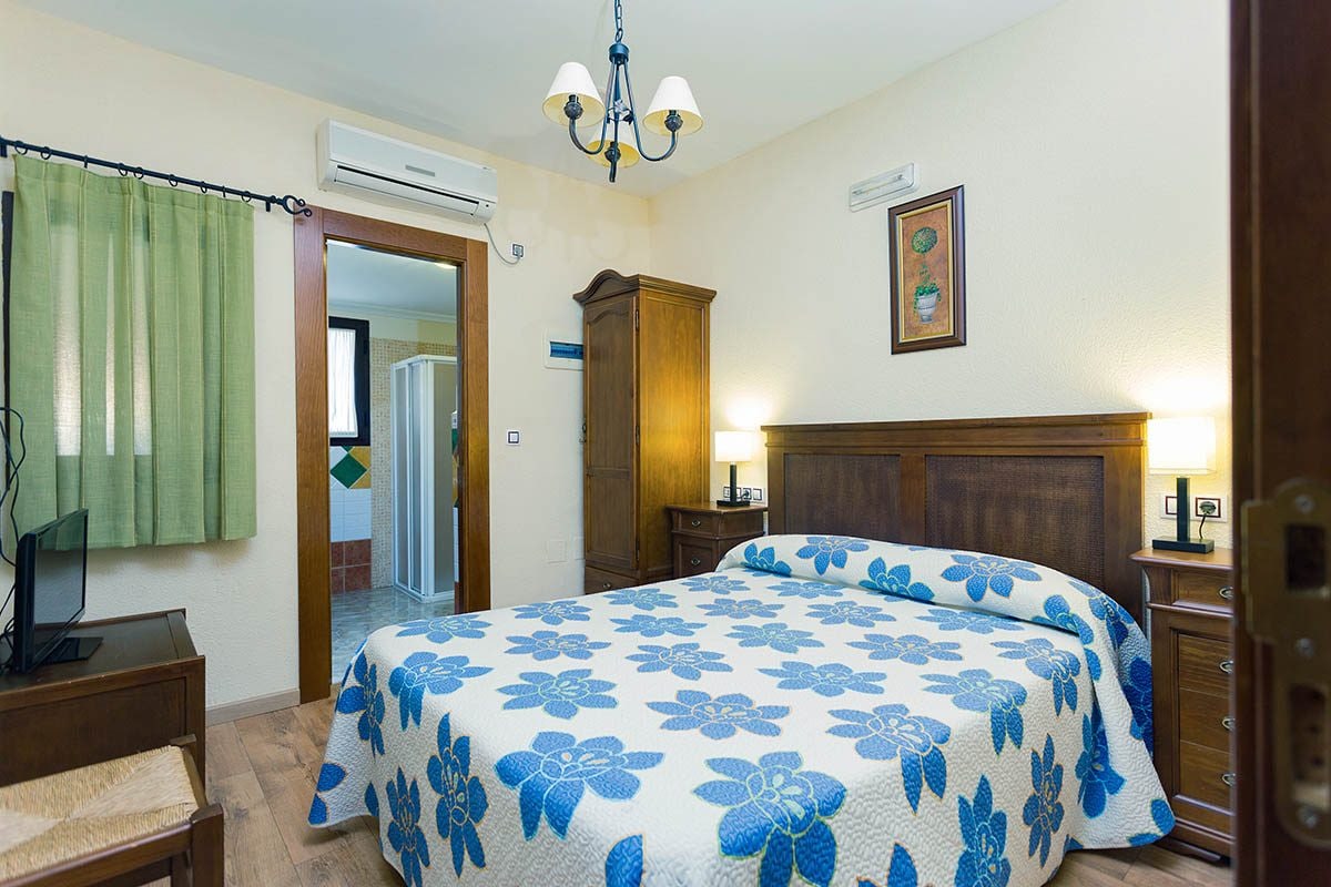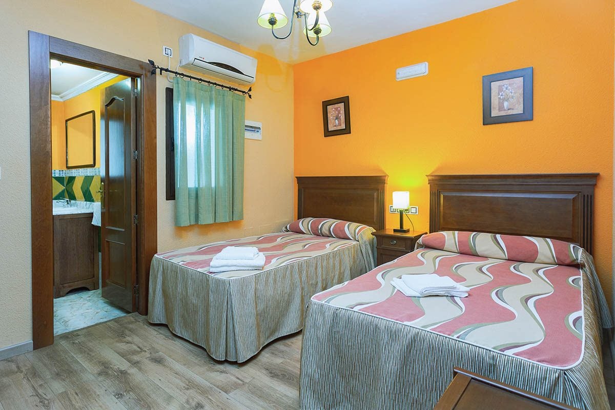 Relájese en dos cómodas camas individuales vestidas con sábanas de algodón fresco, perfectas para un descanso reparador. La habitación, con su techo de vigas de madera expuestas, crea una atmósfera cálida y acogedora, mientras que el suelo de baldosa de terracota añade un toque auténtico y tradicional. Comodidades Pensadas para Usted Para su entretenimiento, la habitación dispone de un televisor y un amplio armario de madera que ofrece espacio suficiente para su equipaje. Disfrute de la privacidad y el confort en su baño privado, equipado con ducha y bidé, donde los detalles de azulejos en tonos neutros crean un ambiente sereno para comenzar o terminar el día. El baño tiene un estilo rústico que complementa el resto de la habitación. El techo presenta vigas de madera oscura y el suelo es de baldosas que parecen de terracota, a juego con la habitación. Las paredes están alicatadas con un patrón decorativo de azulejos en tonos azules y beige. El baño está equipado con un lavabo de pedestal de porcelana blanca, un inodoro y un bidé. La zona de ducha está separada por una cortina de ducha blanca y no hay bañera. Sobre el lavabo hay un gran espejo rectangular. En general, el baño tiene una apariencia limpia y funcional, siguiendo la misma estética rústica de la habitación.