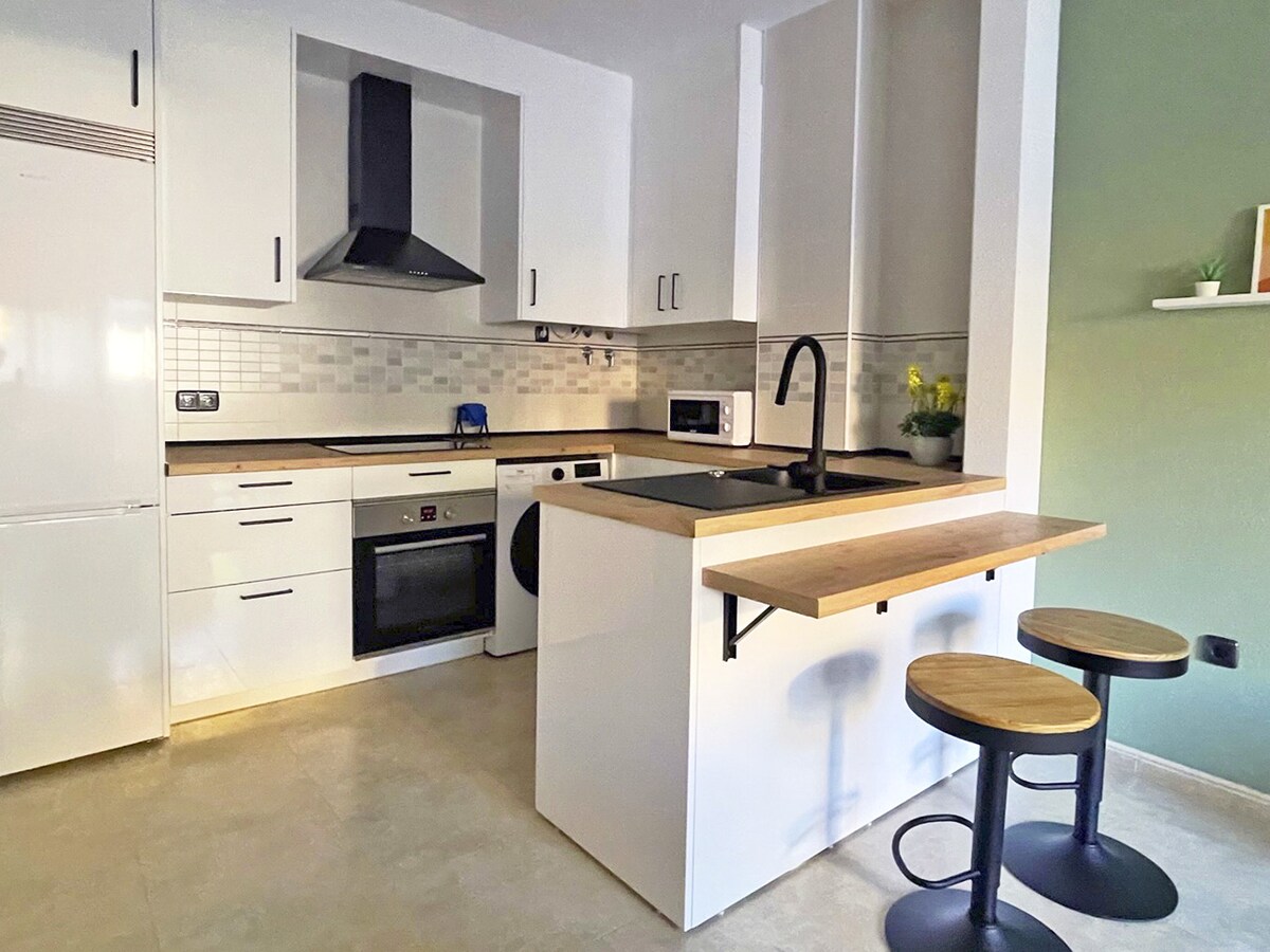Relaxează-te și relaxează-te în acest apartament pe malul mării, în stil mediteranean, confortabil, funcțional și practic Ea are un living cu bucătărie complet utilată, două dormitoare duble cu 1,50 și 1,55 paturi. O canapea extensibilă în sufragerie. O baie completă. TV cu acces la internet, mașină de spălat rufe, uscător de rufe, cafetieră, prăjitor de pâine, aer condiționat. Cearșafuri și prosoape incluse. Se află într-o enclavă privilegiată cu o multitudine de servicii, baruri, terase, magazine...
