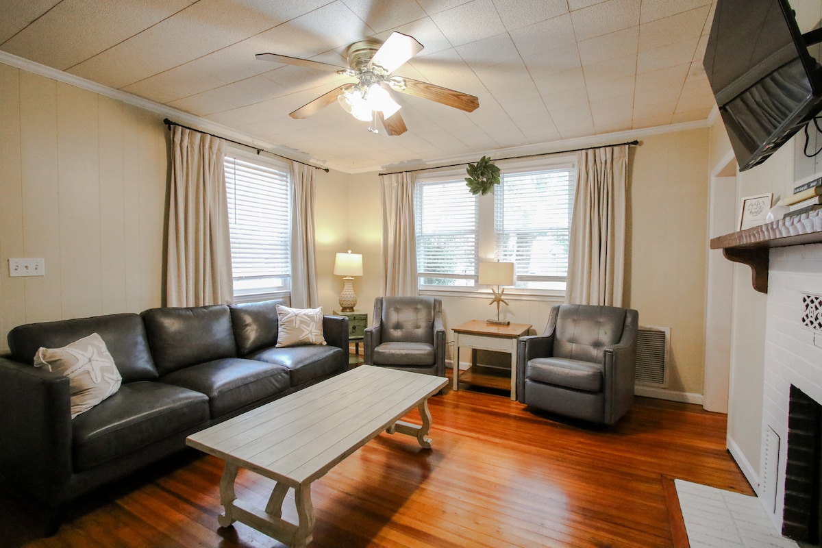 There is so much to love about this charming little house! It was built in 1905 and has many original features such as 11ft ceilings, hardwood floors and multiple built in fireplaces. Yet it also has a few modern day updates such as the fully stocked, island kitchen; the best of both worlds! You can enjoy your morning coffee in the rocking chairs on the front porch and grill dinner under the string lights on the back deck where we have a cute, fenced in back yard! Just make yourself at home!