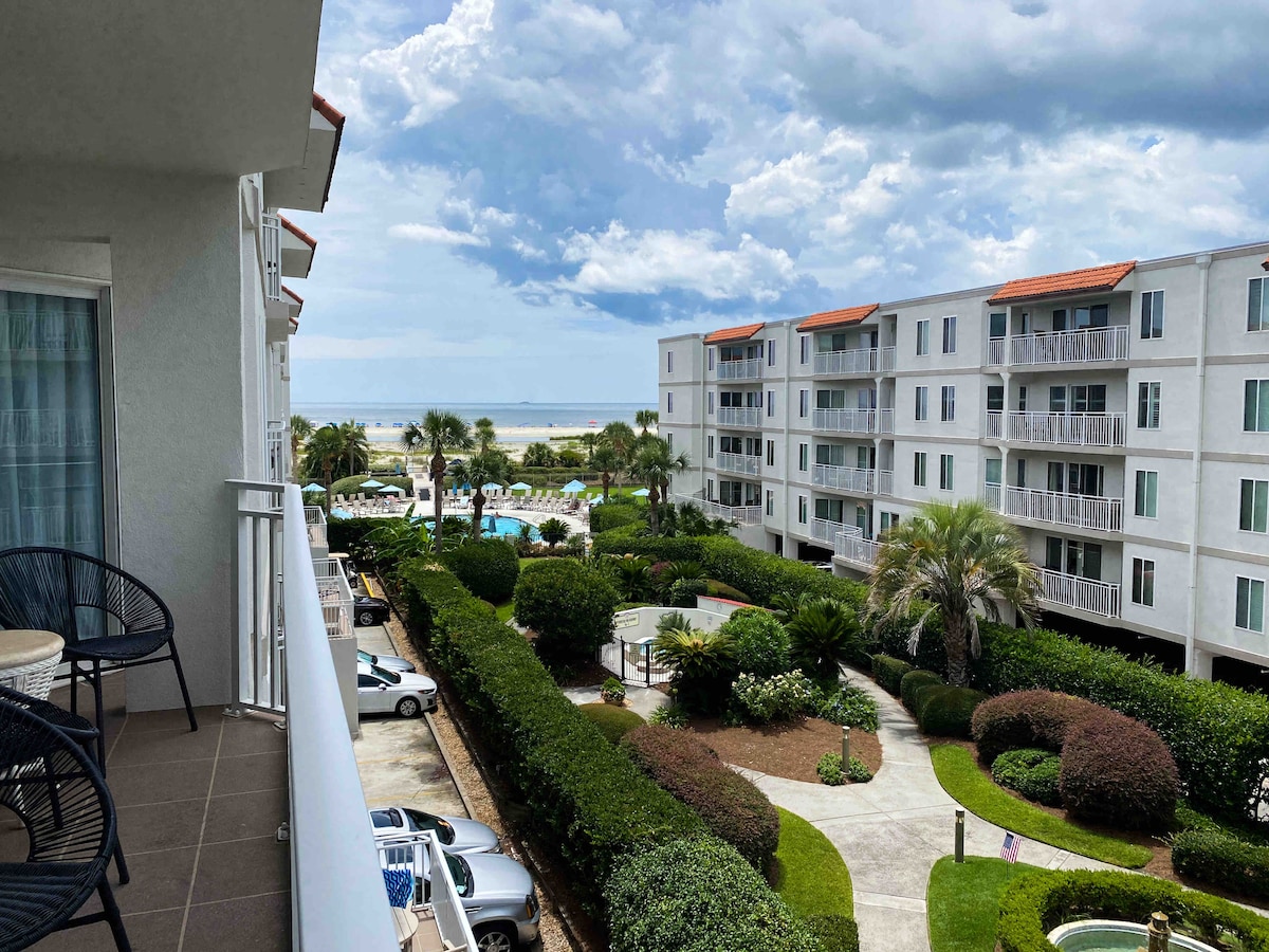 Comfort, relaxation, and beauty await you here - On the quieter and most private side of the Beach Club - with direct, gated beach access . Enjoy our oceanside saltwater pool, 2 hot tubs, and lush gardens - in the perfect spot, on one of the prettiest beaches in the South! Primary suite with king bed, walk-in shower/soaking tub. Second bedroom with 1 queen/ 1 twin, full bathroom. Well-equipped kitchen, full balcony... Come on, the dolphins are waiting for you!