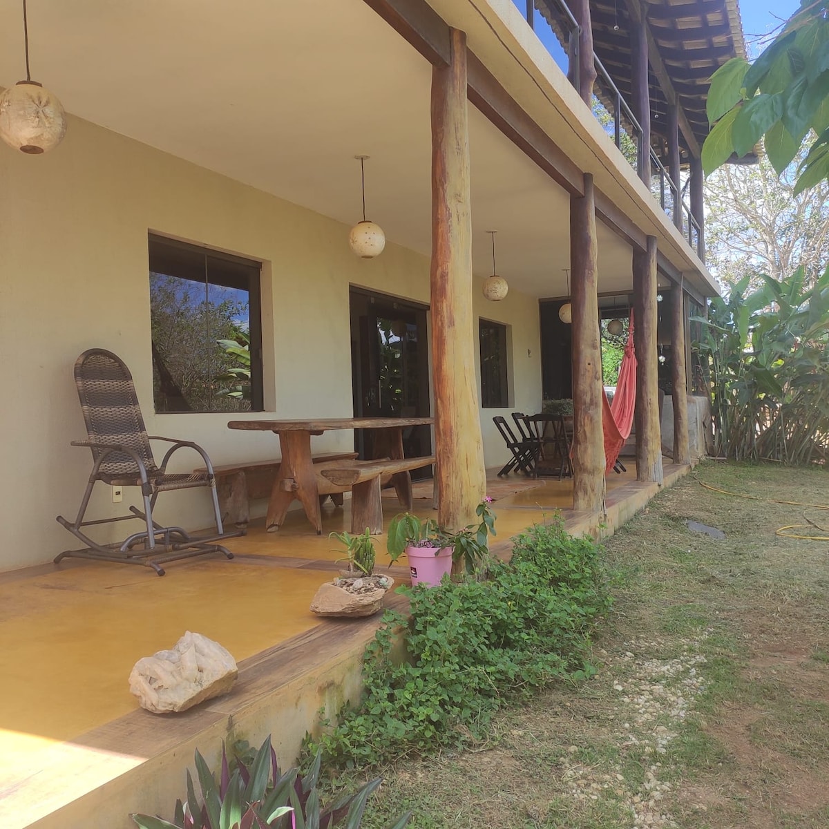 Casa rústica, charmosa e arejada, inspirada no Cerrado e localizada a apenas 150m da avenida principal de Alto Paraíso. Conta com 1 suíte, sala de estar, cozinha equipada integrada ao deck/varanda com redes e mesas, terraço, amplo jardim com árvores nativas, área para fogueira, garagem privativa e Wi-Fi de qualidade. O refúgio perfeito para relaxar e se conectar com a Chapada dos Veadeiros. Seja muito bem-vindo a Casa Cúrcuma!