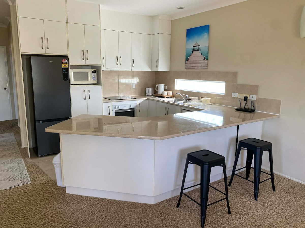 Enjoy a comfortable stay in this centrally located two-bedroom post-war home, with a large deck and pool. Perfect for small families, couple retreats or a working holiday equipped with a study space. Fully airconditioned, with fans and wifi supplied. We offer an entire home including a queen and double bed. There is a neat kitchen equipped for you to make a meal or you can just pop down the road for a coffee from one of our best roasters in town, Good Morning Coffee Trader.