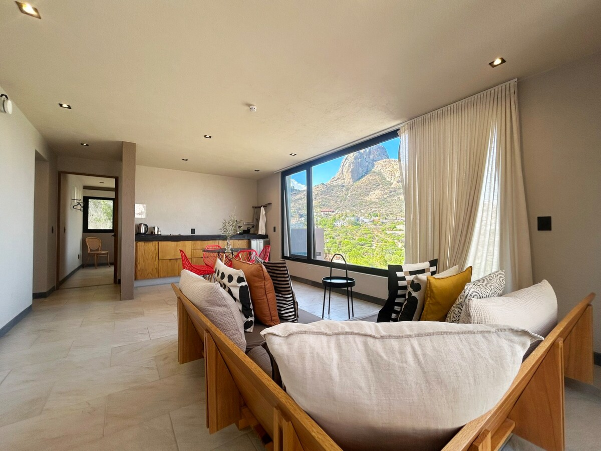 ¡Despierta frente a la majestuosa Peña de Bernal desde cada rincón del departamento! Ubicado en el corazón del Pueblo Mágico de Bernal, este espacio combina comodidad y la mejor vista. Cuenta con una terraza ideal para admirar amaneceres o noches estrelladas, sala, habitación con cama queen y cocina equipada. Su ubicación céntrica te permite explorar a pie tiendas, restaurantes y la icónica peña. Perfecto para parejas o familias pequeñas que buscan relajarse con un paisaje inigualable.