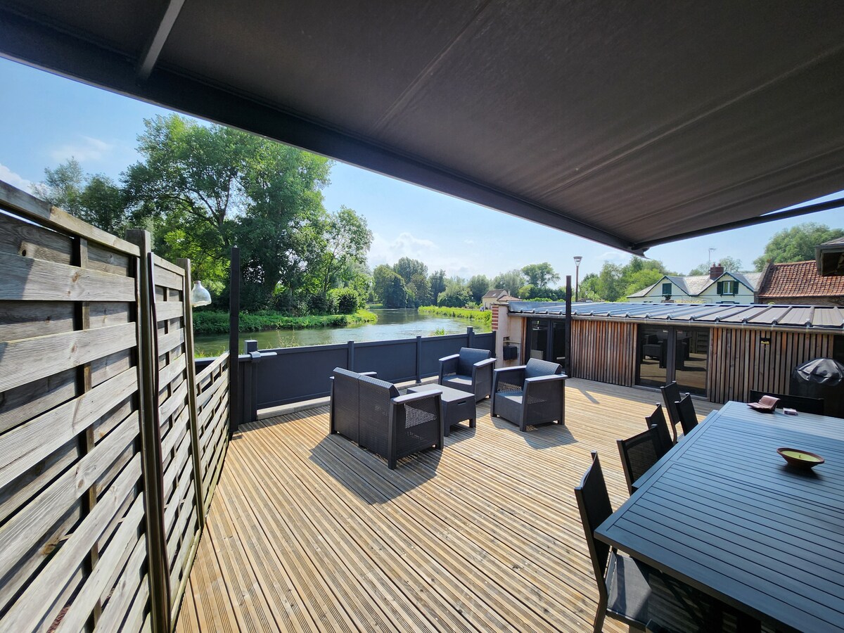 ATENȚIA PĂRȚII NU ESTE PERMISĂ CARTIER ÎN APROPIERE Casă pentru 10 persoane cu maximum 8 adulți Casă pe malurile Somme. Terasă pe picioroange cu vedere directă la Somme pe calea de remorcare. Un cadru verde în oraș, ca în mediul rural. 100m2 terasă cu jacuzzi și saună Excelent pentru o săptămână sau un weekend împreună cu familia sau prietenii. Situat în Dreuil-Lès-Amiens, la 10 minute cu bicicleta de centrul orașului, de-a lungul sumei, lângă calea de remorcare.