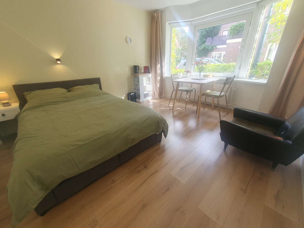 Un studio privat minunat la parter. Are o cameră spațioasă, luminoasă, cu un pat dublu, o canapea și o masă (de lucru). Are o ușă privată, o intrare/hol și o baie privată. Bucură-te de soare pe banca din grădina din față. Eu și soția mea locuim alături: ușa de legătură este încuiată pentru a garanta intimitatea. O stradă intimă și liniștită în animatul Amsterdam Est. La câțiva pași se află o mulțime de restaurante la modă, magazine, muzee, parcuri, stație de metrou, gară.