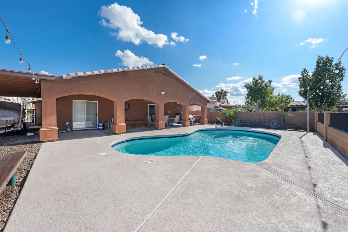 Te vei bucura de sejur în această locuință DE LUX complet mobilată. Are 4 dormitoare, 2 băi și un living cu concept deschis și o zonă de bucătărie. Relaxează-te pe terasa mare acoperită, lângă piscină. Poziție excelentă în apropiere de magazine, terenuri de golf și restaurante. Ești la doar o scurtă plimbare cu mașina de Mexic, râul Colorado, dunele de nisip și drumețiile.