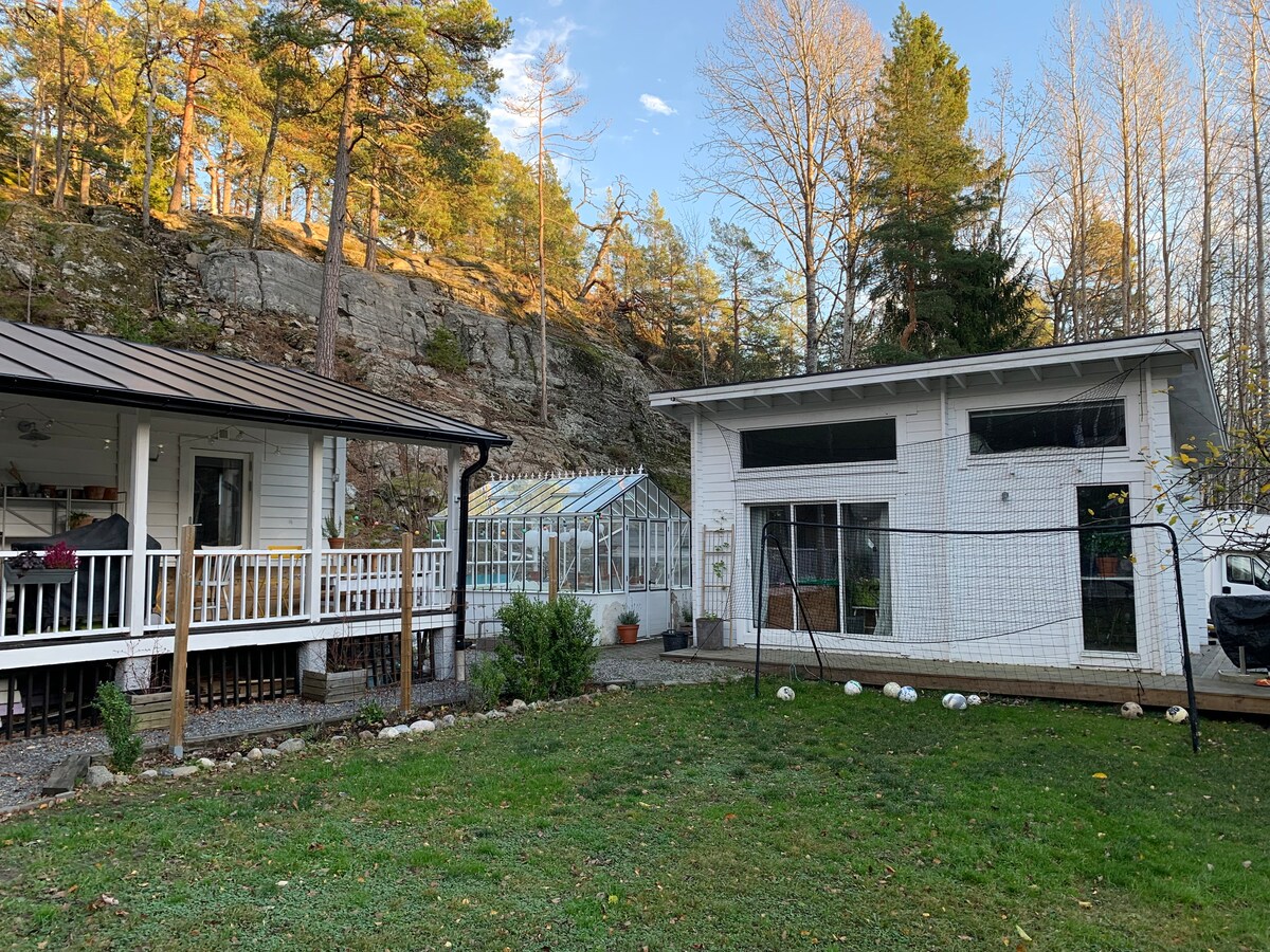 Welcome to this two bedroom + bathroom cottage facing a stunning southerly view over the archipelago of Stockholm, and with a private jetty for swimming and relaxing. Attached mountainbikes/bikes, kajaks, sauna and hottub are for guest disposal. Suitable for couples or the small family to enjoy a relaxing stay at the port of Stockholm, with nature at your doorstep. Private sitting area outside cottage, with fully equipped outdoor kitchen, barbecue possibilities and view over the ocean.