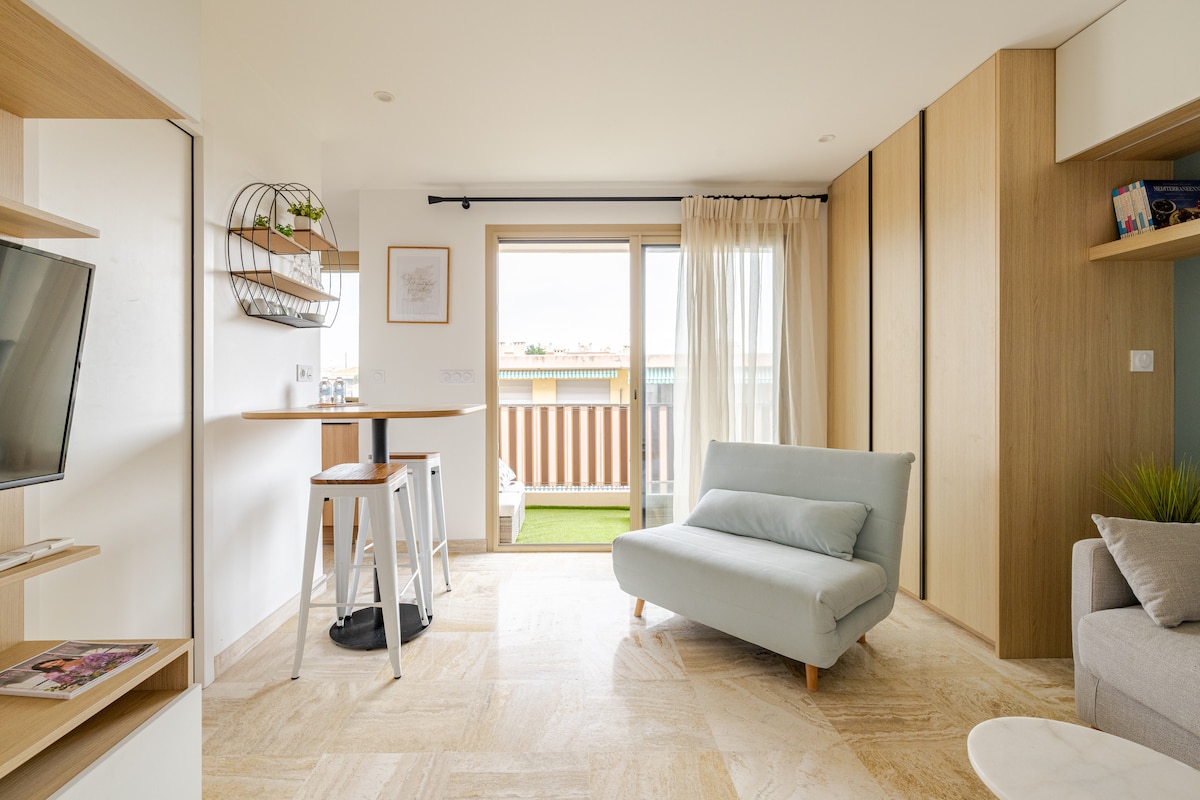 Rare ⭐ Perle ⭐ Grand Studio complet echipat (cearșafuri, prosoape, umbrelă...) complet privat, terasă mare, liniștit. pat matrimonial. Aproape de Port d 'Antibes la 6 minute de mers pe jos, nod de transfer Antibes, autobuz, gară la 5 minute de mers pe jos, aproape de centrul orașului Antibes 10 minute. Spațiul trebuie returnat curat (ca la sosire), în caz contrar se pot percepe taxe. Ai la dispoziție pentru primul tău mic dejun: ceai,cafea,zahăr.