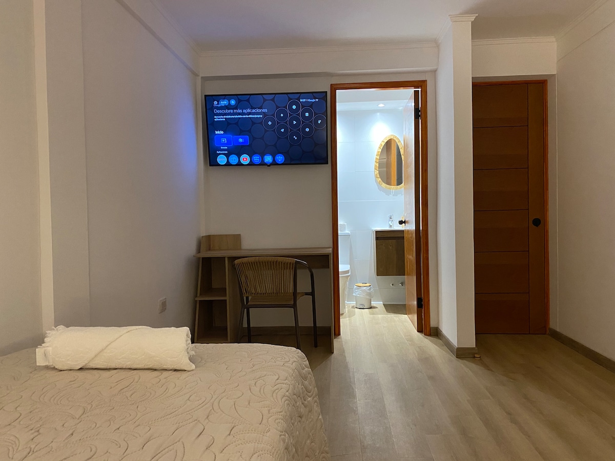 Amplia y cómoda habitación, baño privado, ubicada en un cuarto nivel con vista interior. Cuenta con closet, velador, escritorio y smart TV 43”. Ropa de cama de algodón, gel de ducha, shampoo y acondicionador. Servicio de limpieza y cambio de sábanas 1 vez a la semana.