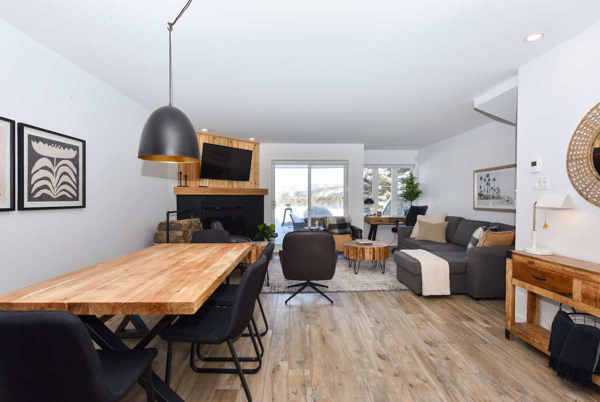 Welcome to a cozy Mont-Tremblant townhouse where snowy days end by the fire and golf-course views set a calm backdrop for your stay. Ideal for families or friends looking to unwind close to nature. - Sleeps 8 | 4 bedrooms | 5 beds | 3 baths - Townhouse on La Bête golf course w/ scenic views - Wood-burning indoor fireplace for cozy winter nights - 2 living areas w/ smart TVs, cable & streaming - Private patio & balcony overlooking the course - Pet-friendly, self check-in & free parking