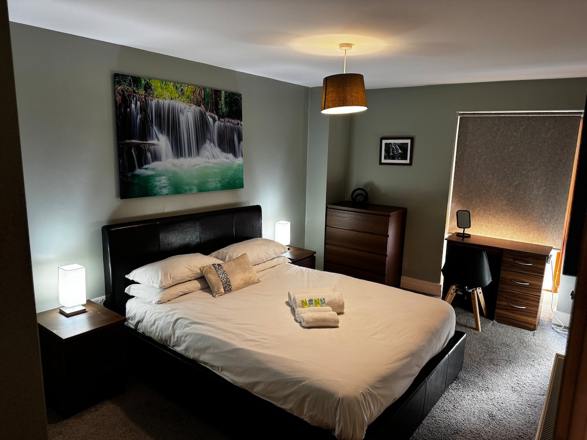 Bucură-te de o experiență superioară în Belfast din acest apartament elegant modern, situat central. Acces ușor la toate aeroporturile, feriboturile și o bază excelentă de unde să explorezi Irlanda de Nord. O plimbare scurtă te duce în centrul Belfastului, la Titanic și la Cartierul Catedralei, plus toate zonele principale de vânzare cu amănuntul. Centrul comercial York Gate se află la 10 minute de mers pe jos. Acces facil la drumurile principale pentru a explora coasta Causway. Bucătărie complet utilată. Două dormitoare duble mari, 1 baie privată. WiFi rapid disponibil.