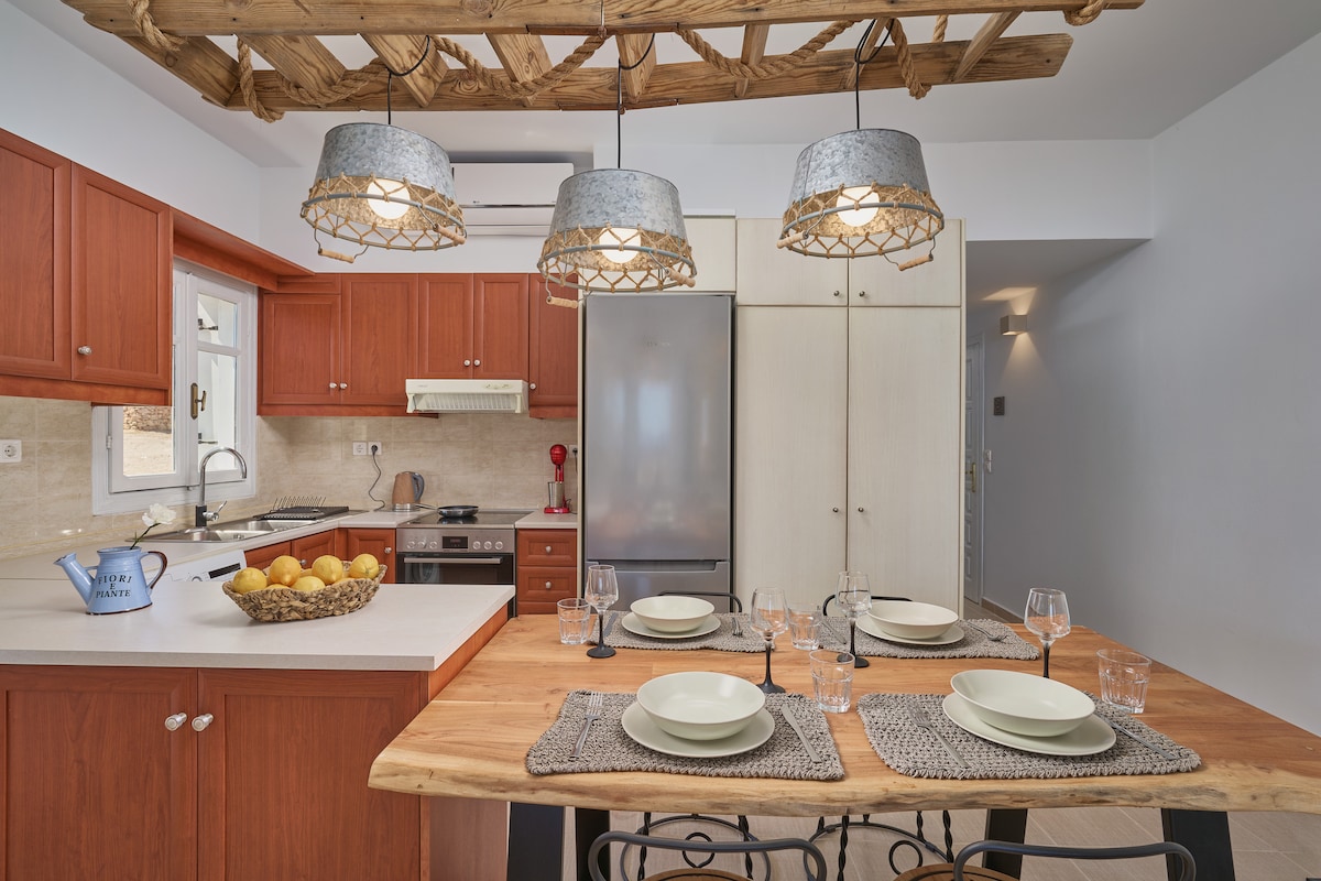 Irene's Cottage Myrtonas este o evadare liniștită pe deal, perfectă pentru cupluri. La doar 15 minute de plaja Kyra Panagia, oferă vedere la mare, o terasă privată mare cu grătar, bucătărie completă, spațiu confortabil de luat masa/living și un pat tradițional Karpathiko cu spațiu de depozitare. Cu aer condiționat, Wi-Fi și mașină de spălat, îmbină confortul, farmecul și stilul karpatian autentic pentru o escapadă romantică și relaxantă.