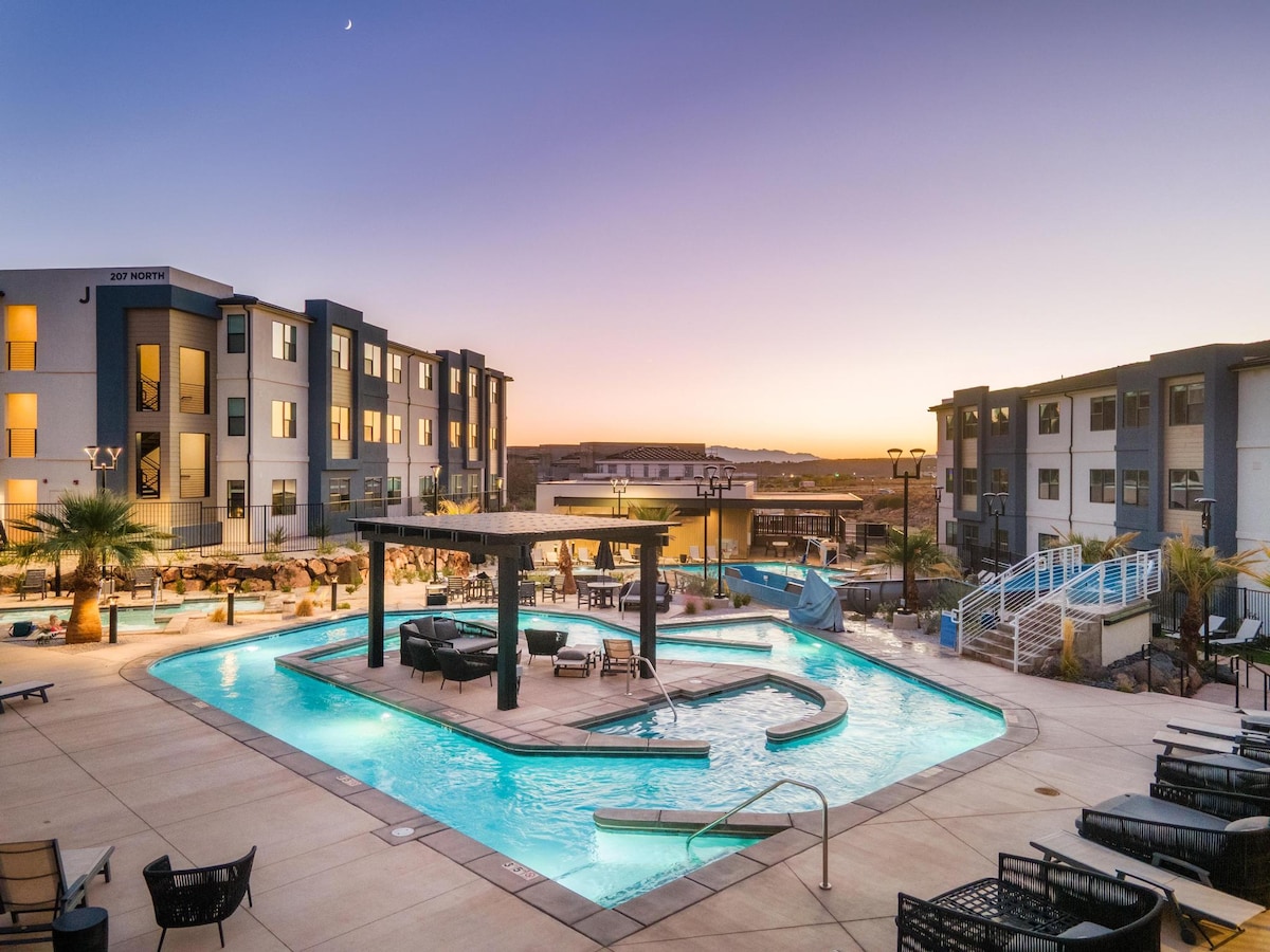 Noua ta cazare preferată din sudul statului Utah. Nu vei găsi un loc mai bun. Acest apartament nou-nouț este rafinat. 2 bd, 2 ba, bucătărie completă, iar parcul acvatic este chiar în fața ferestrei din spate. E frumos. Capacitate de până la 6 persoane. Două paturi king-size și o canapea extensibilă. Bucătărie complet utilată. Televizor mare cu ecran mare de 4k 85". Mașină de spălat/uscător. Parcul acvatic conține un râu leneș, tobogan, o cadă cu hidromasaj imensă de 16 persoane și piscină. Întregul parc acvatic este deschis și încălzit pe tot parcursul anului. O să vă placă la nebunie!!