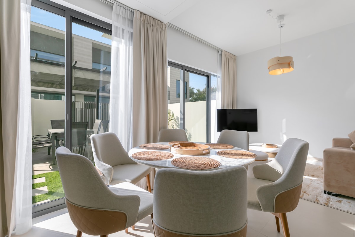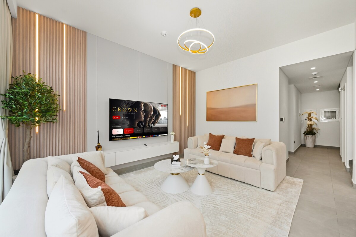 Intră într-o vilă unde spațiul, lumina soarelui și stilul se împletesc fără efort. În inima Jumeirah Village Circle (JVC), ești perfect poziționat — suficient de aproape pentru a simți pulsul centrului orașului și al portului, dar suficient de departe pentru a te retrage în sanctuarul tău privat. Bucătăria complet utilată invită la mic dejun lent și cine lungi, zona de living de lux — completată cu un televizor de 85 inch — stabilește scena pentru seri de film sau după-amiezi relaxate. Acesta nu este un loc de cazare — este un loc în care să te simți ca acasă.