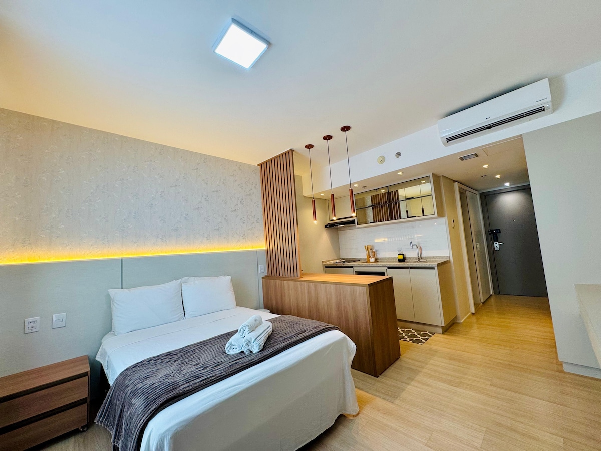 Studio modern de 45 m² în partea de sus a SETOR BUENO, pe T-37 cu T-63. Aproape de SPITALUL Mater Dei, PARCUL Vaca Brava, CENTRUL COMERCIAL Goiânia și centrul medical ORION, ideal pentru agrement, consultații, examene sau muncă. Regiunea are Pão de Açúcar, Oba Hortifr, piețe, farmacii, cafenele și o mare varietate de BUCĂTĂRIE. Spațiul oferă un pat QUEEN, un pat suplimentar, aer condiționat, Wi-Fi rapid, un televizor inteligent și o BUCĂTĂRIE utilată, asigurând o ședere confortabilă, funcțională și confortabilă, perfectă pentru diferite nevoi.